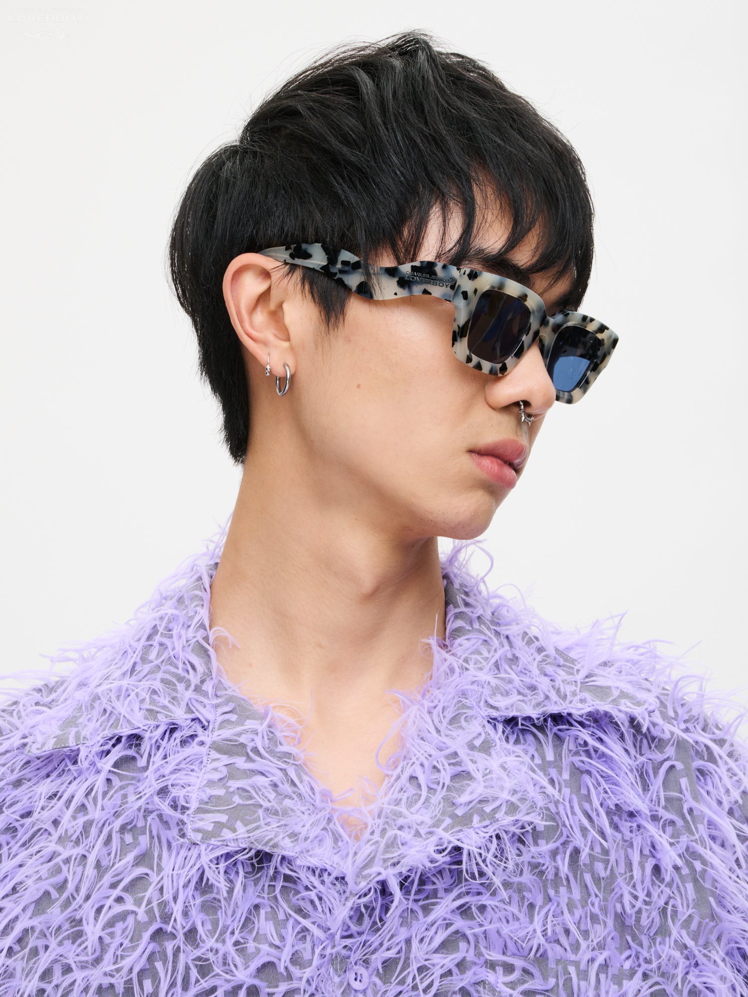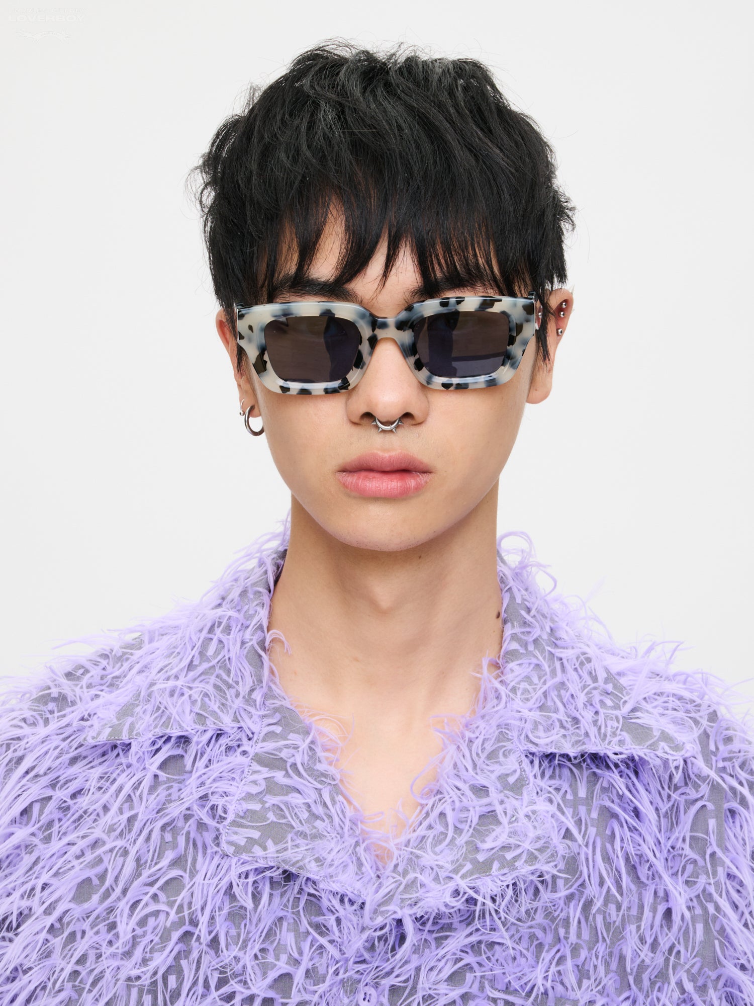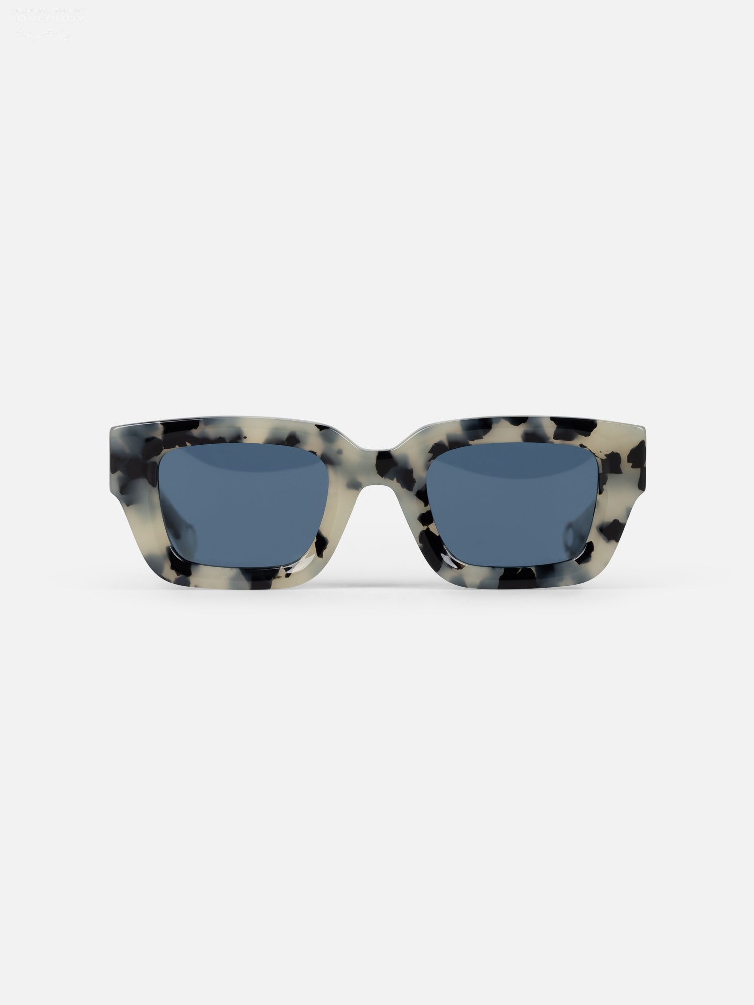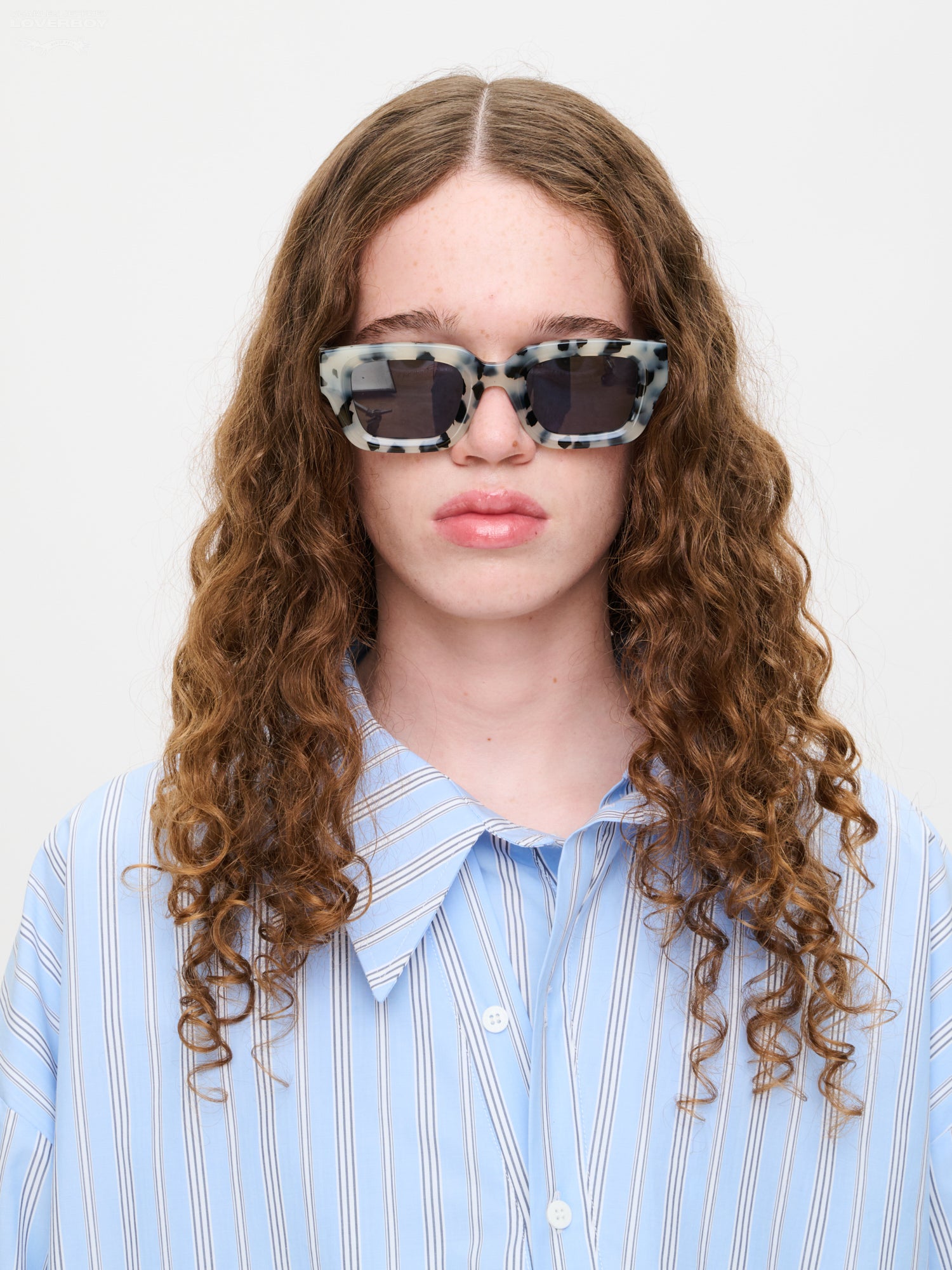 Our Topsy Turvy sunglasses have bold, chunky frames - square lenses and curved arms that give them their name. They're crafted from premium acetate and finished with stainless steel branding at the temple.