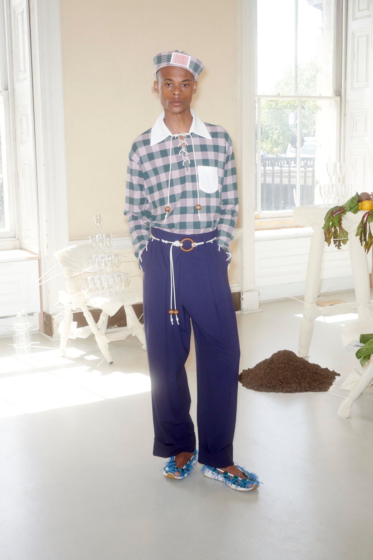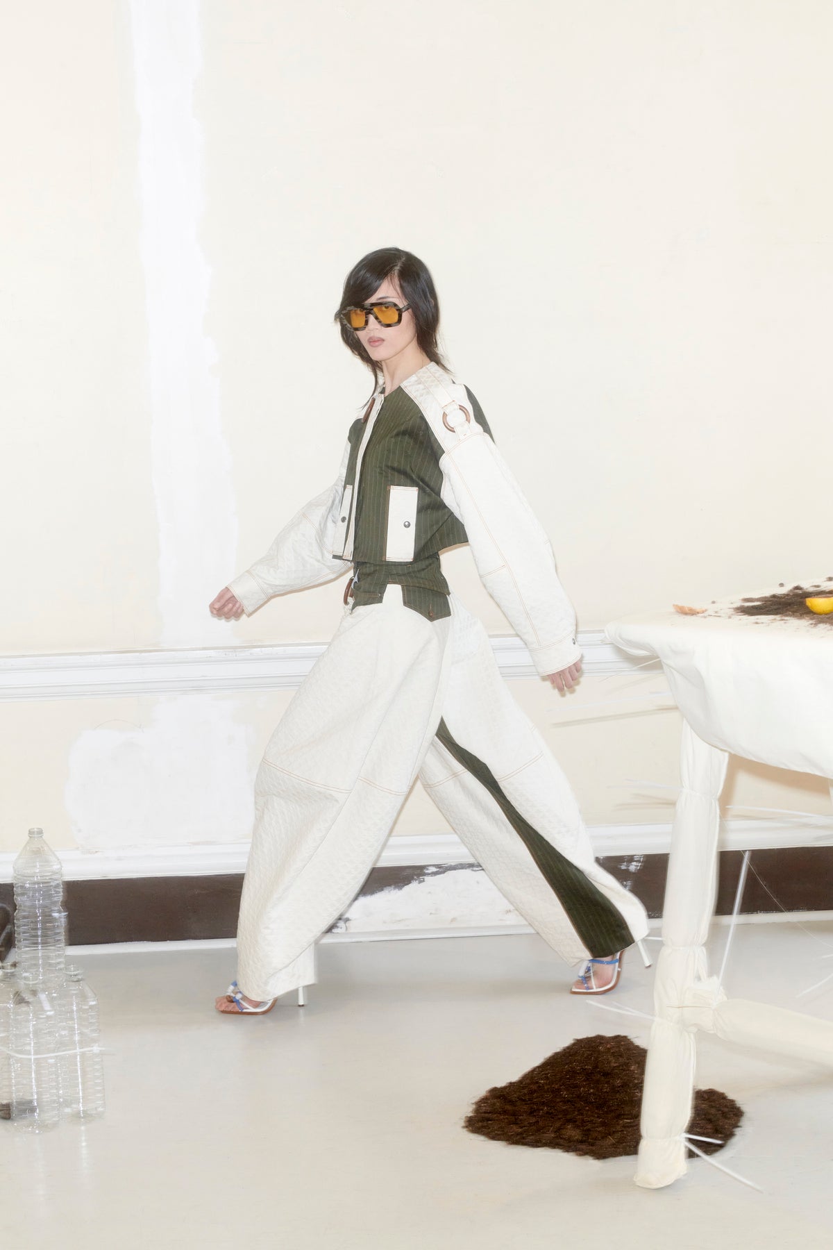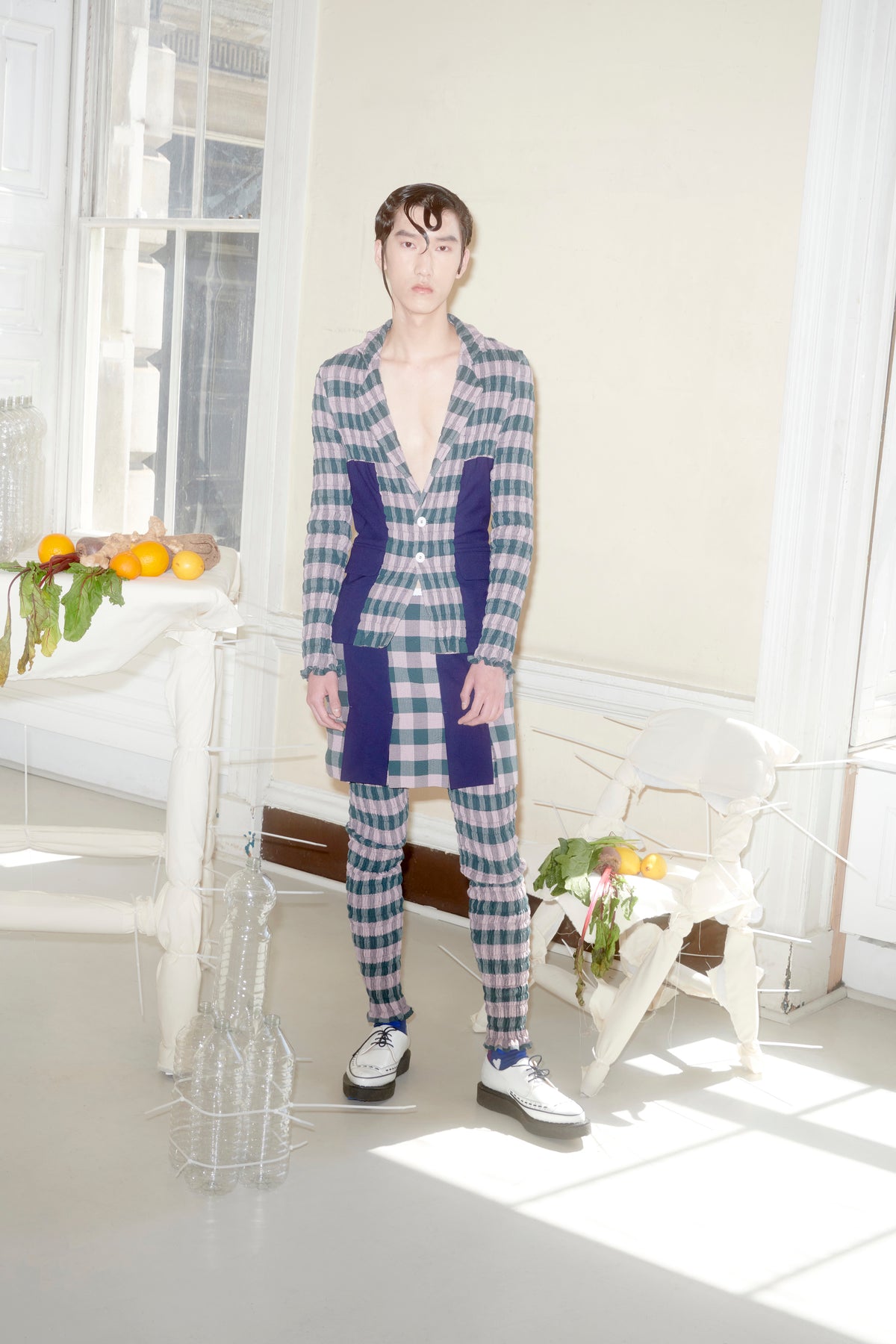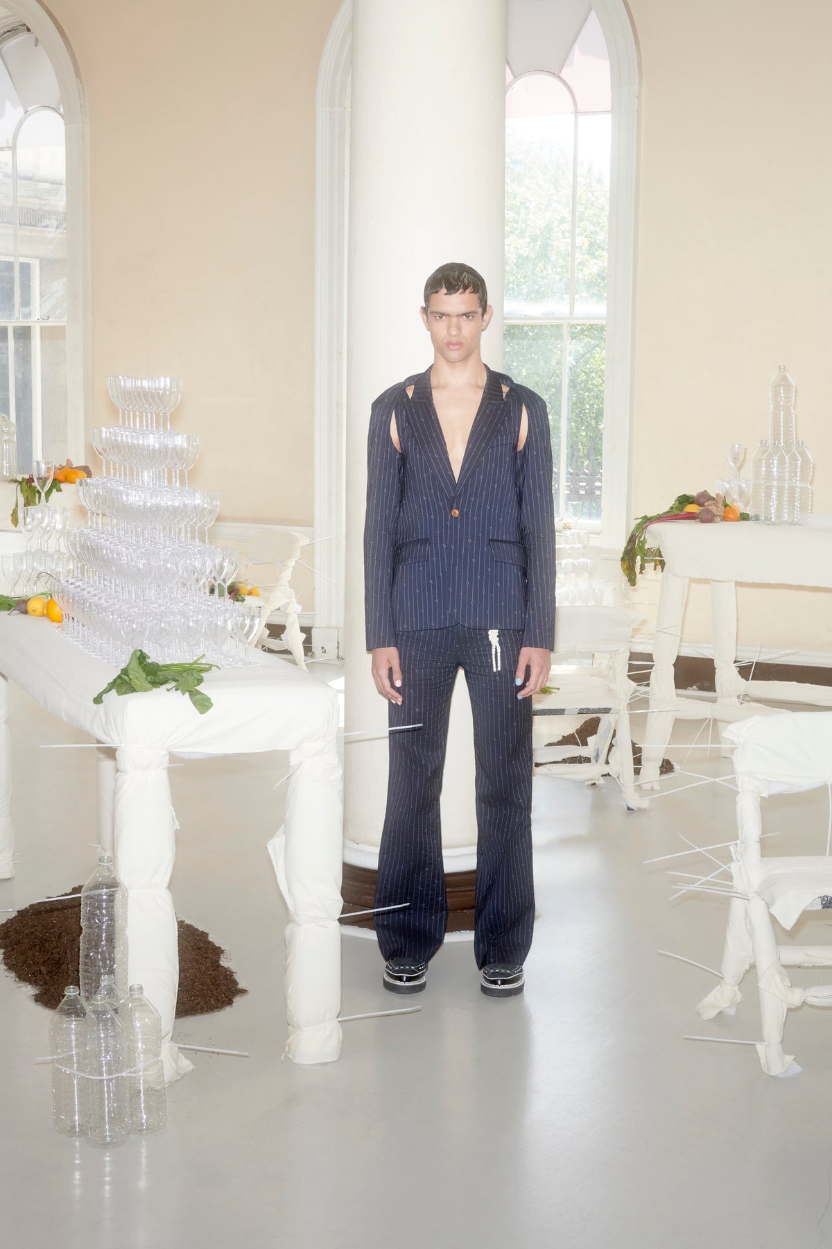 Tailoring, in wool and recycled polyester, is cut with sensuously undulating edges, and comes replete with gender-nonconforming pinstripes and chainmail lining, emboldening the wearer at every turn. Meanwhile, featherlight sheer dresses and ballooning seersucker blouses offer contrasting levity alongside Ancient Greek draping, whilst militaristic adornments are resignified and inverted in wood, providing a gentle critique of the traditionally organised body.