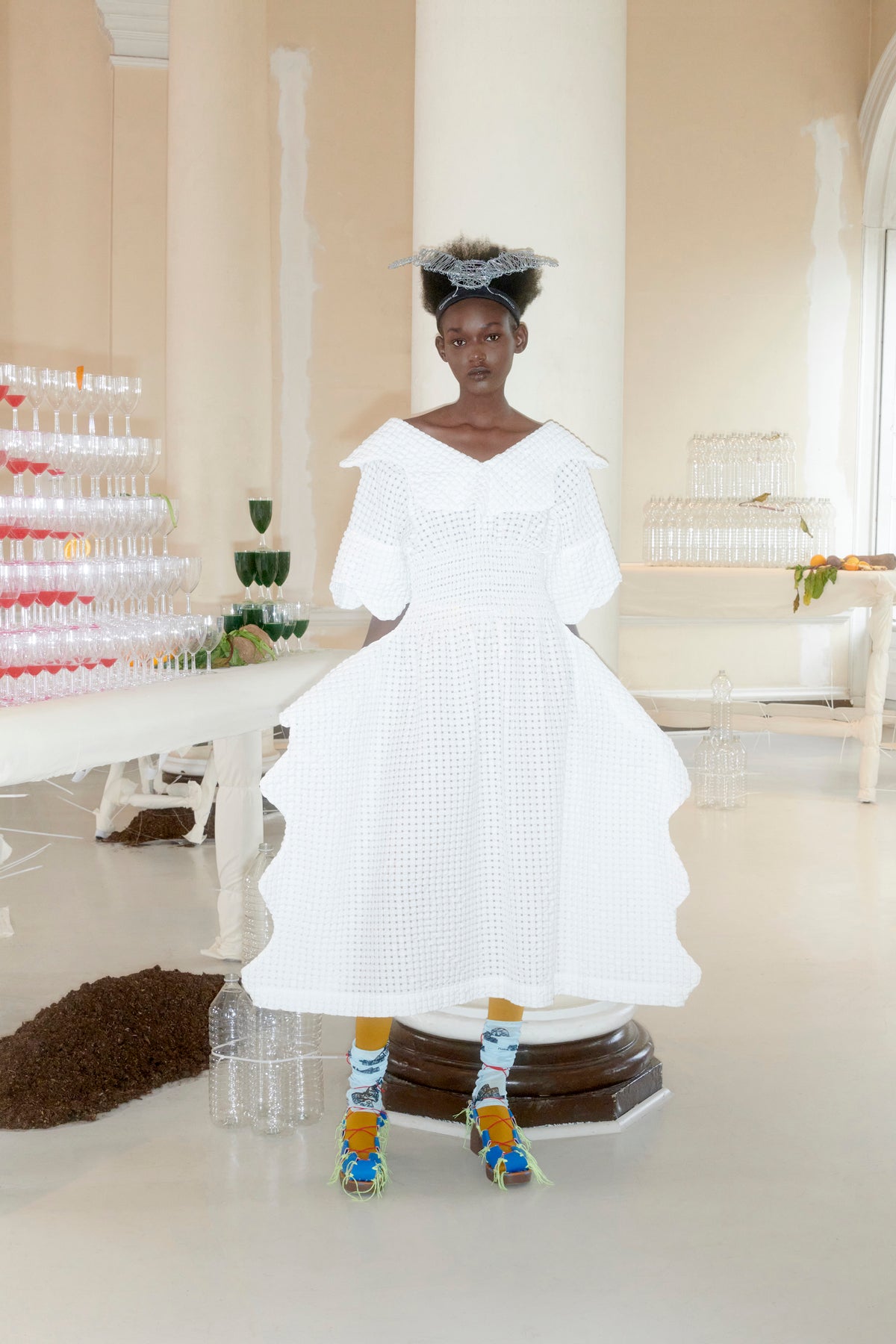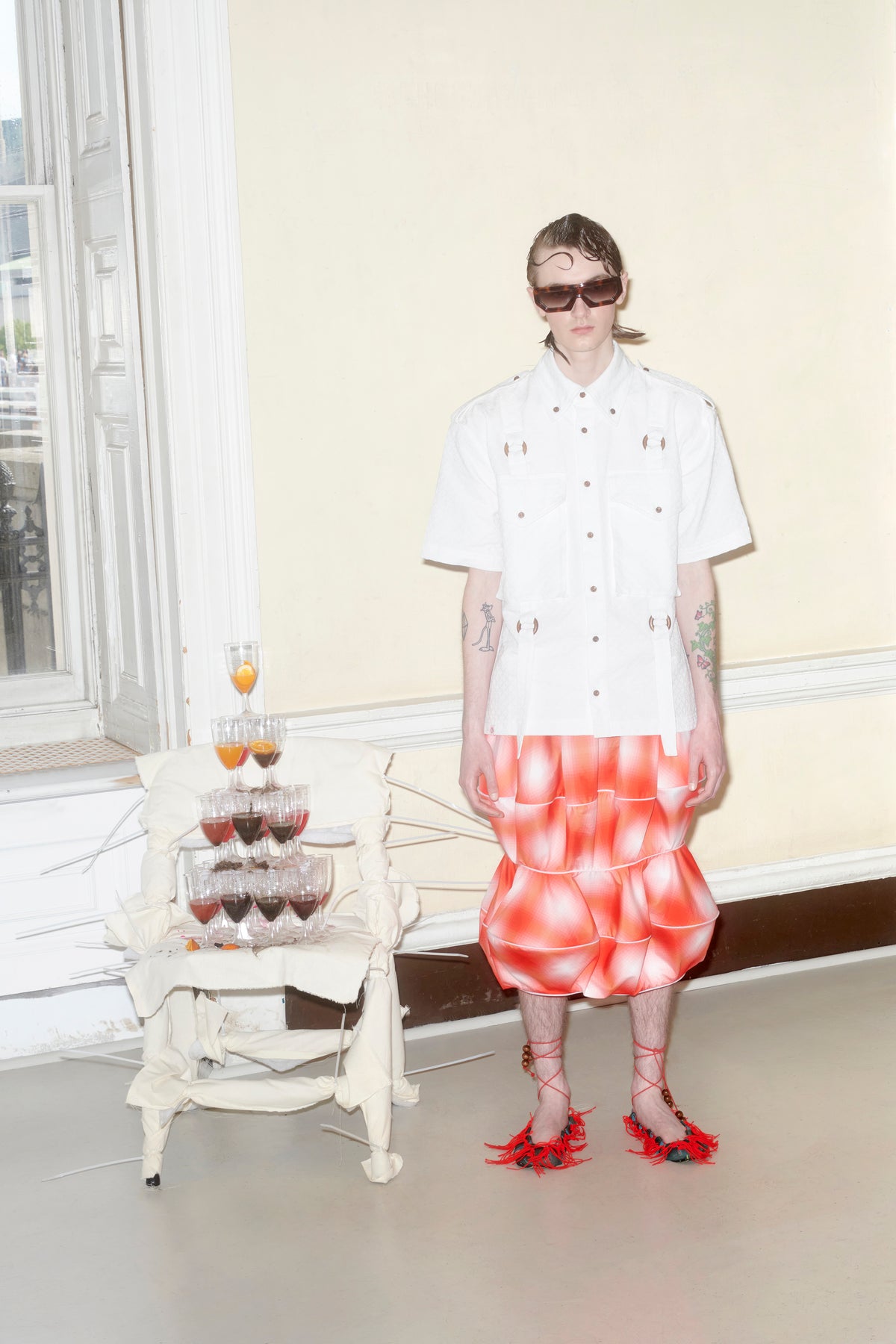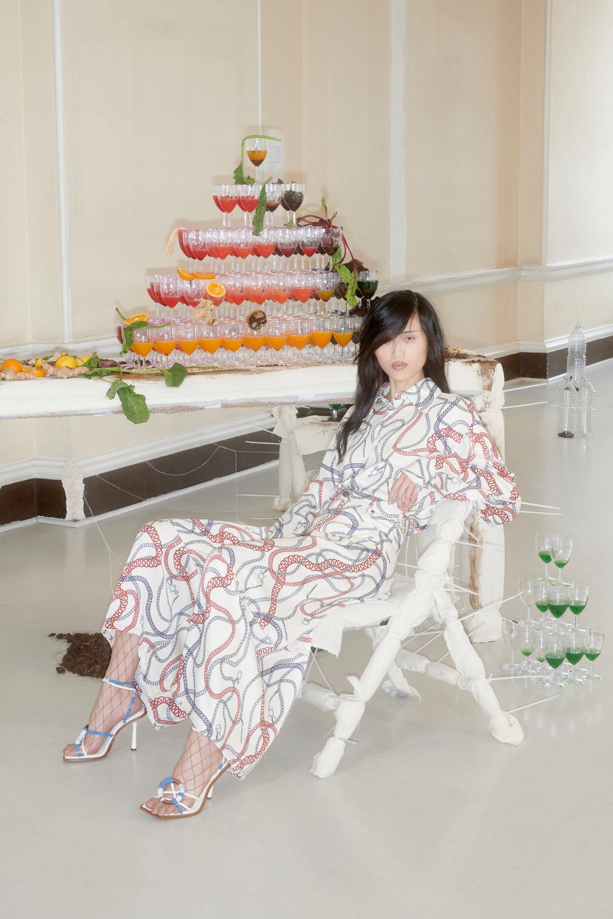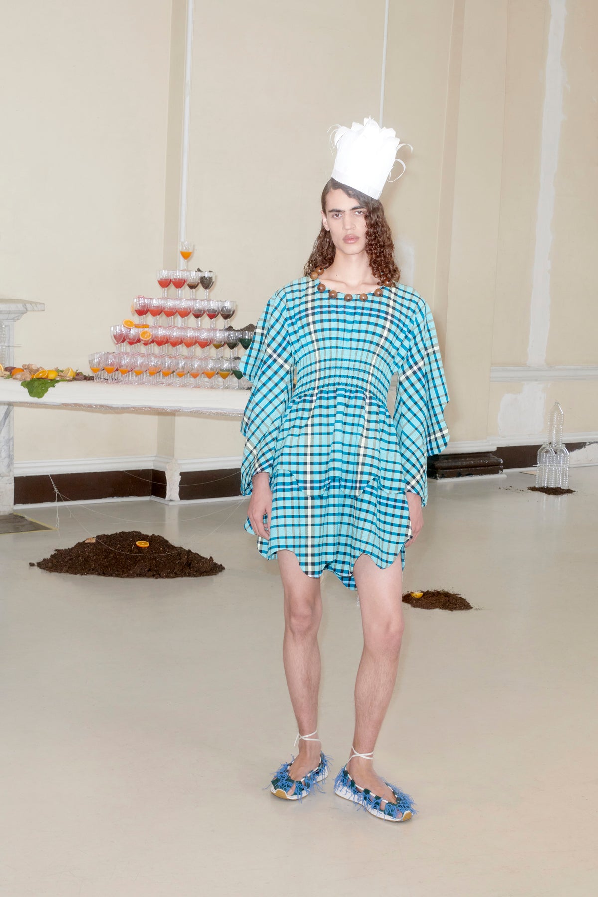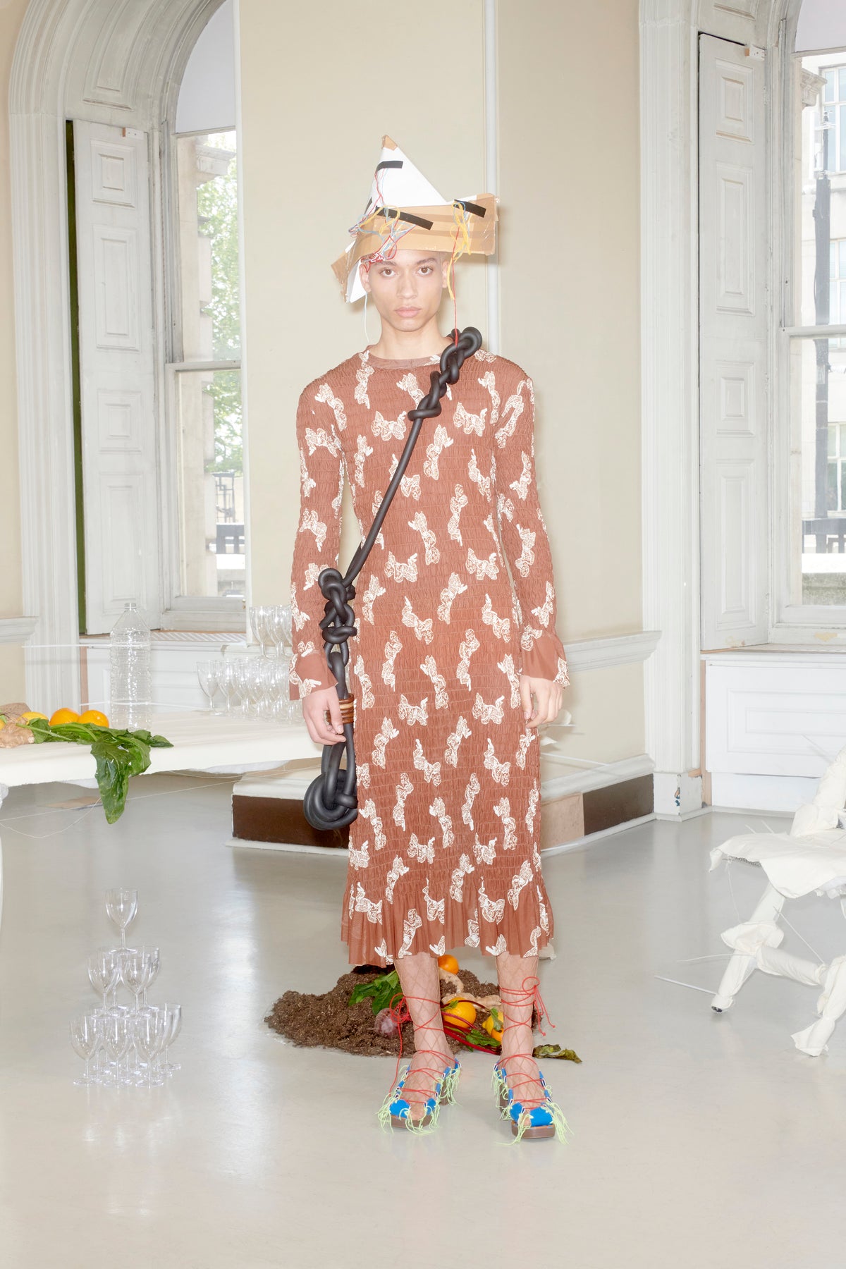 Tailoring, in wool and recycled polyester, is cut with sensuously undulating edges, and comes replete with gender-nonconforming pinstripes and chainmail lining, emboldening the wearer at every turn. Meanwhile, featherlight sheer dresses and ballooning seersucker blouses offer contrasting levity alongside Ancient Greek draping, whilst militaristic adornments are resignified and inverted in wood, providing a gentle critique of the traditionally organised body.