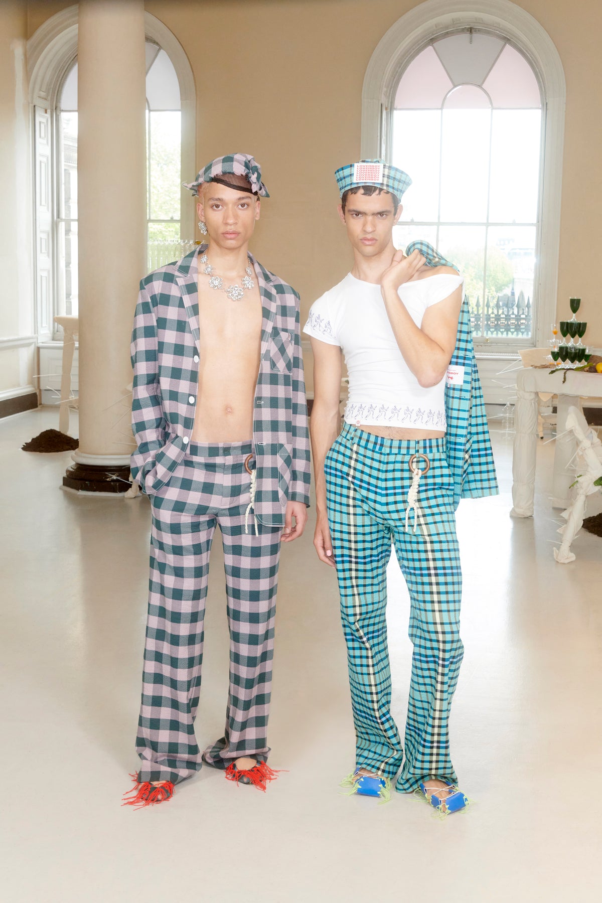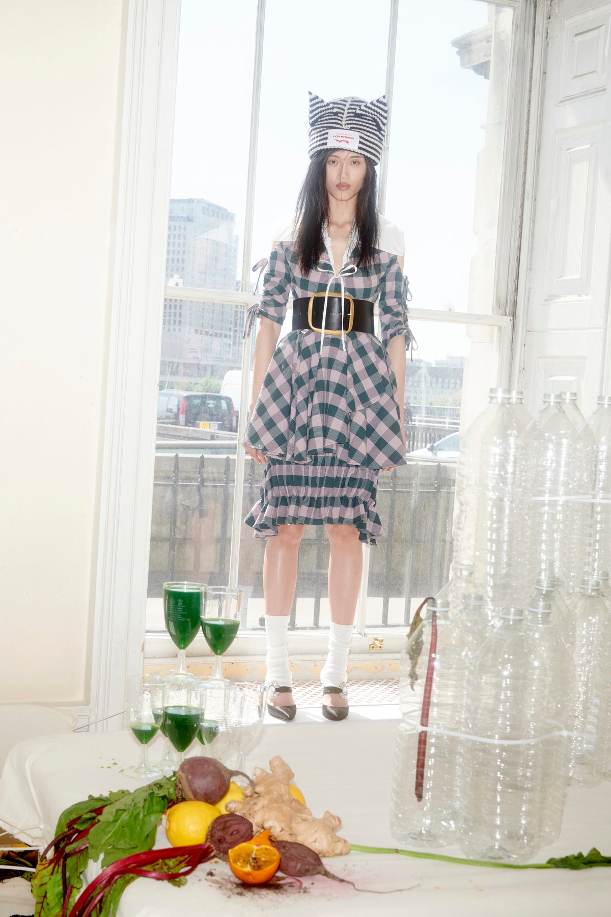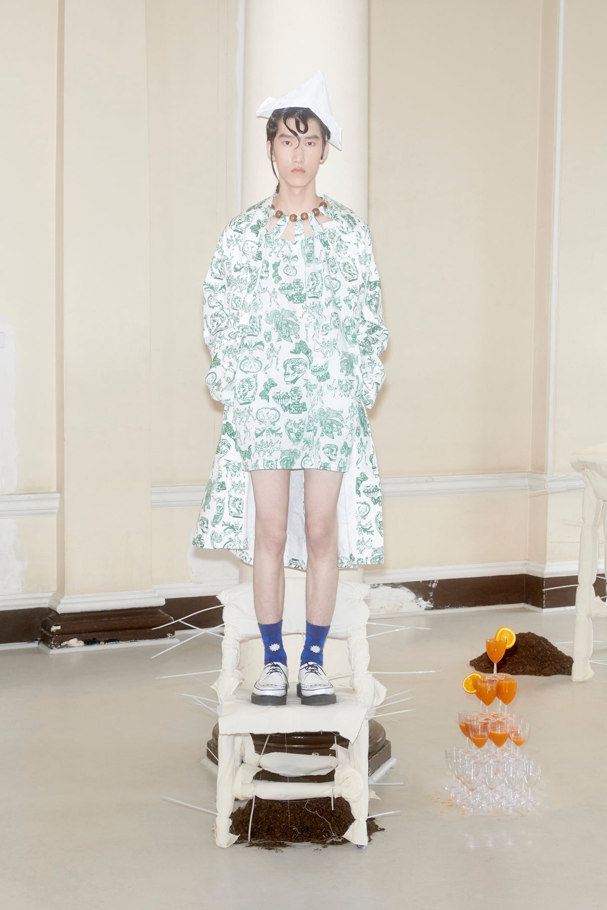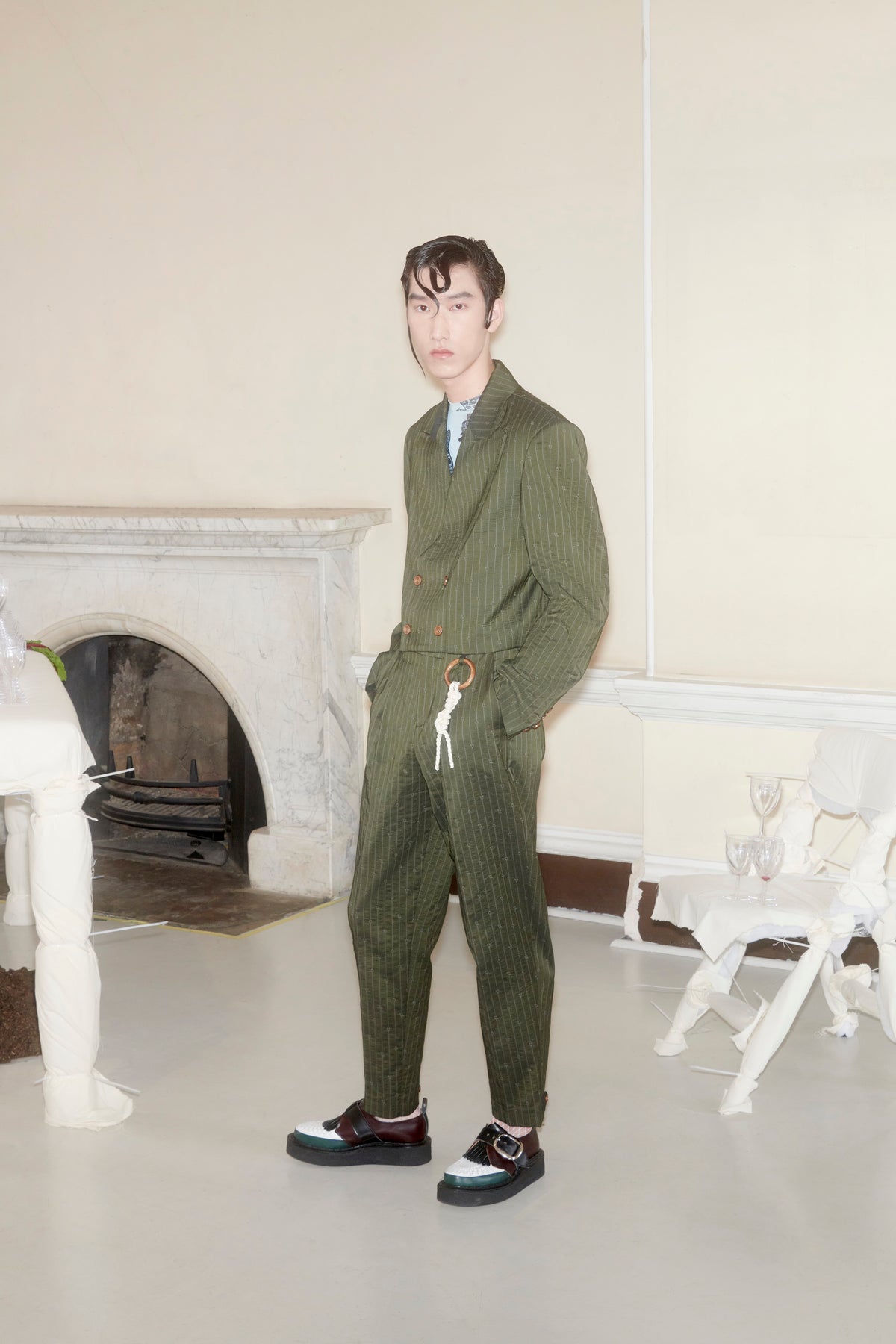 Tailoring, in wool and recycled polyester, is cut with sensuously undulating edges, and comes replete with gender-nonconforming pinstripes and chainmail lining, emboldening the wearer at every turn. Meanwhile, featherlight sheer dresses and ballooning seersucker blouses offer contrasting levity alongside Ancient Greek draping, whilst militaristic adornments are resignified and inverted in wood, providing a gentle critique of the traditionally organised body.