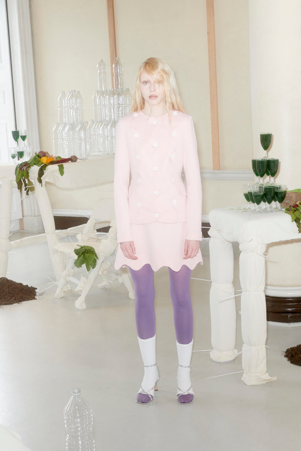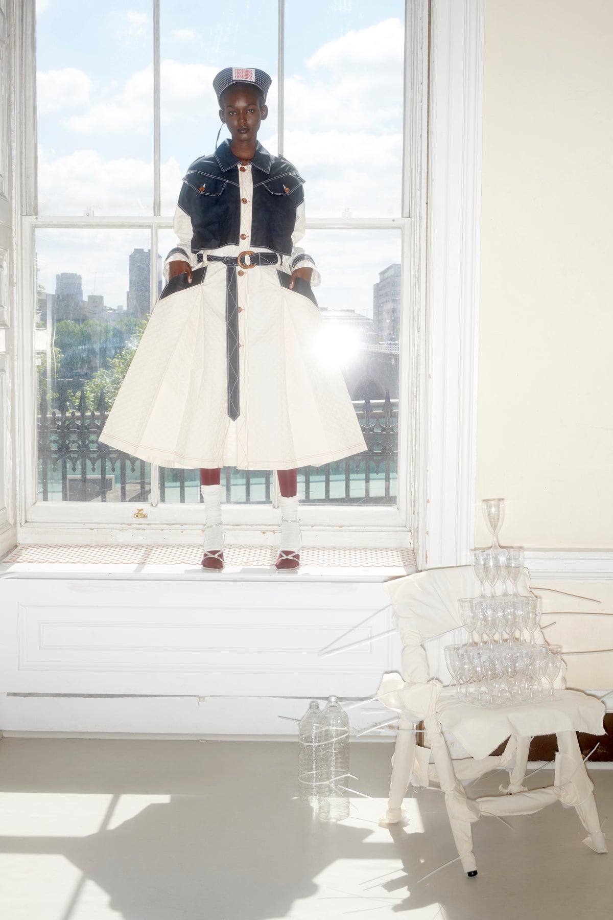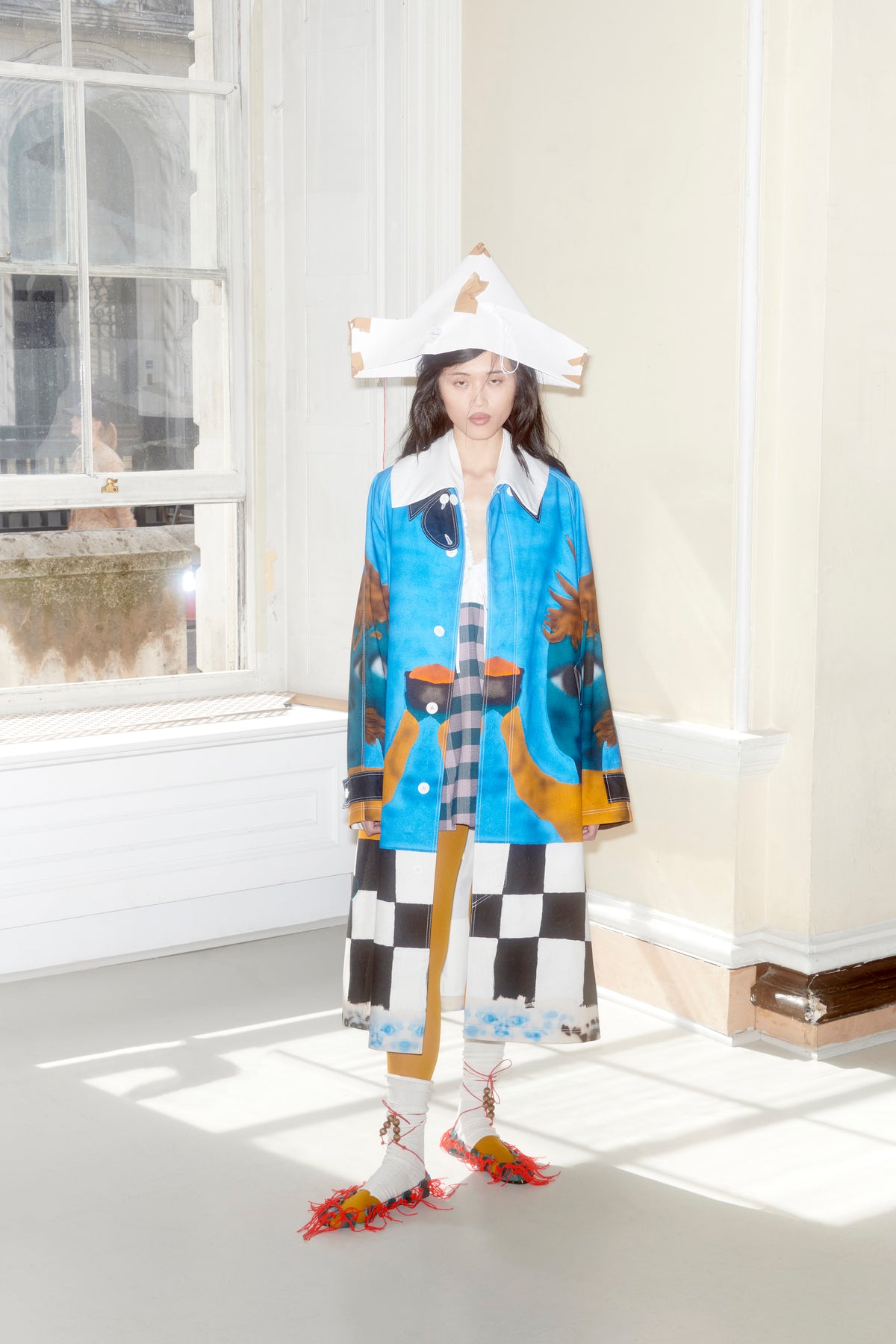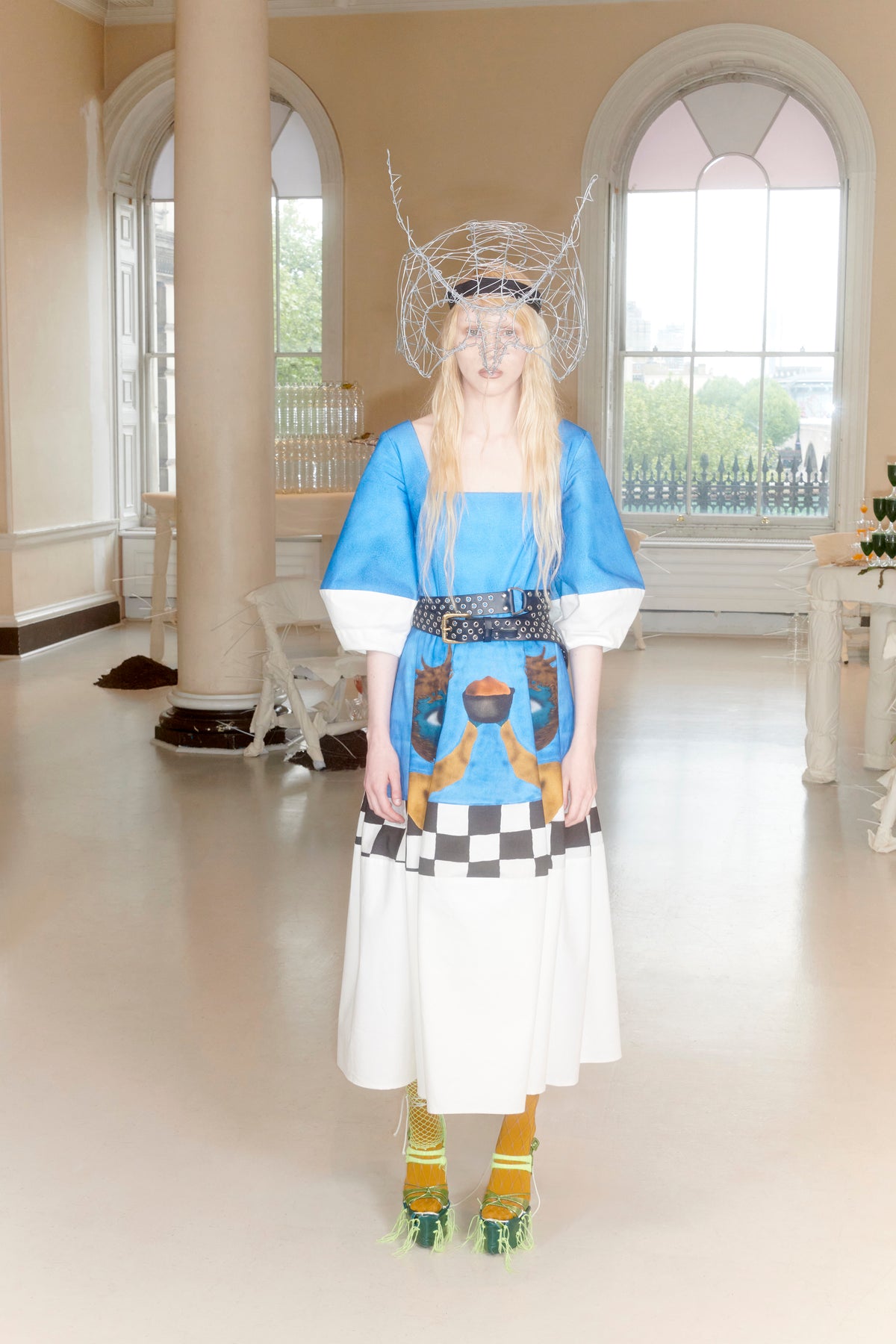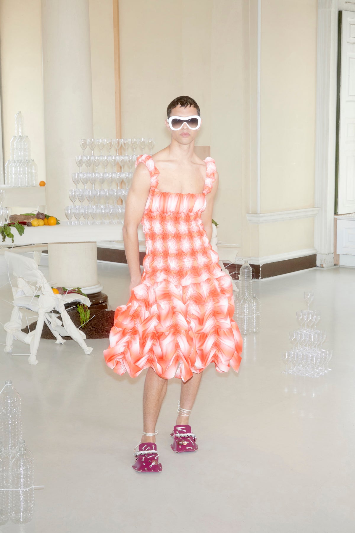 Tailoring, in wool and recycled polyester, is cut with sensuously undulating edges, and comes replete with gender-nonconforming pinstripes and chainmail lining, emboldening the wearer at every turn. Meanwhile, featherlight sheer dresses and ballooning seersucker blouses offer contrasting levity alongside Ancient Greek draping, whilst militaristic adornments are resignified and inverted in wood, providing a gentle critique of the traditionally organised body.