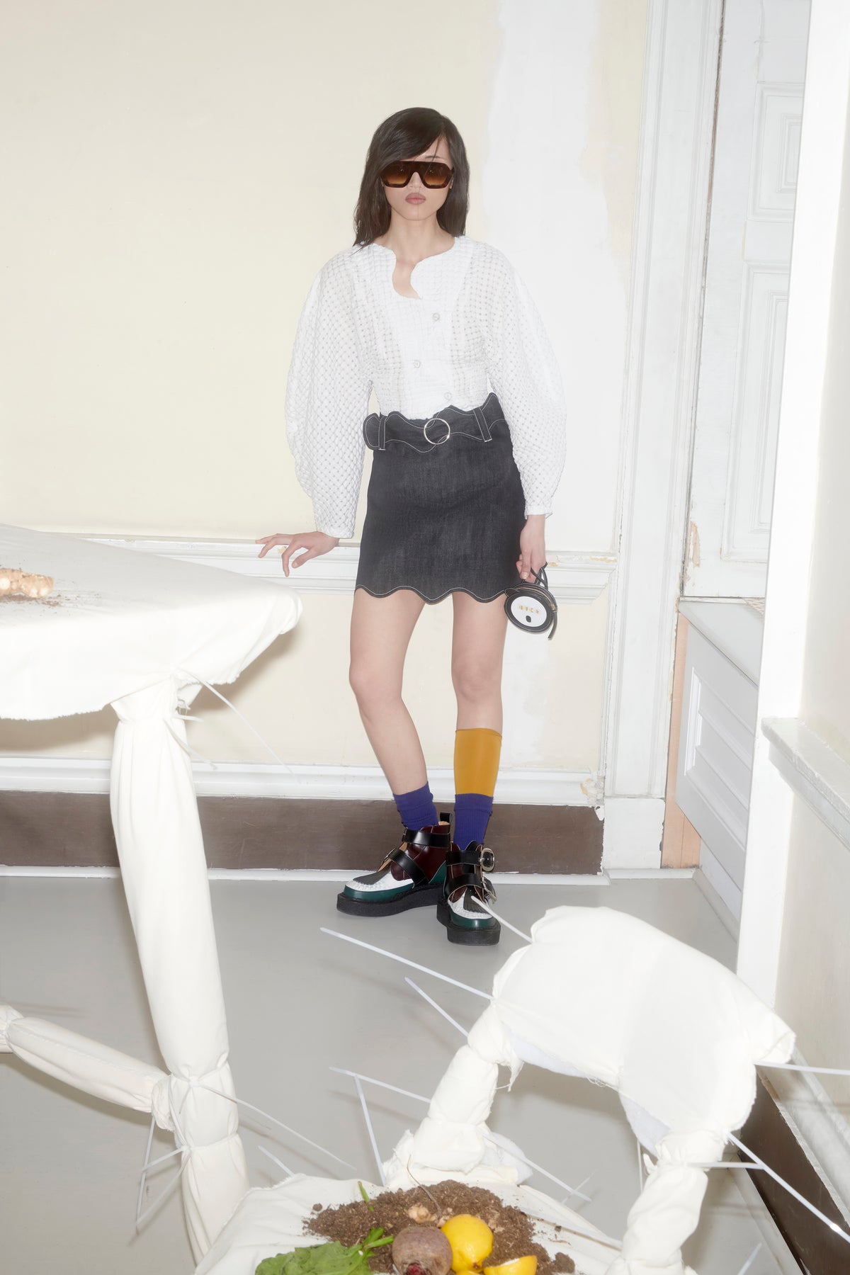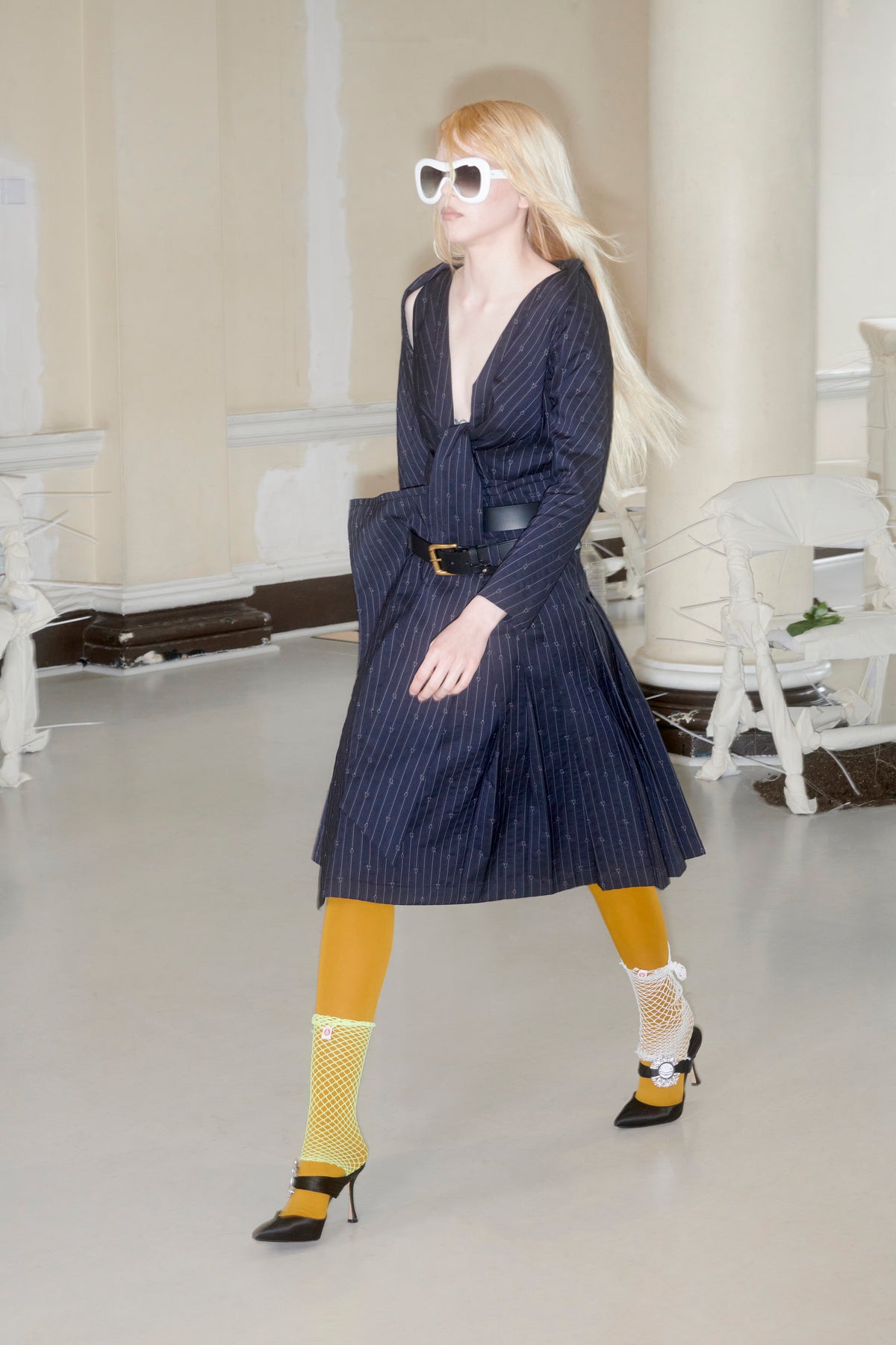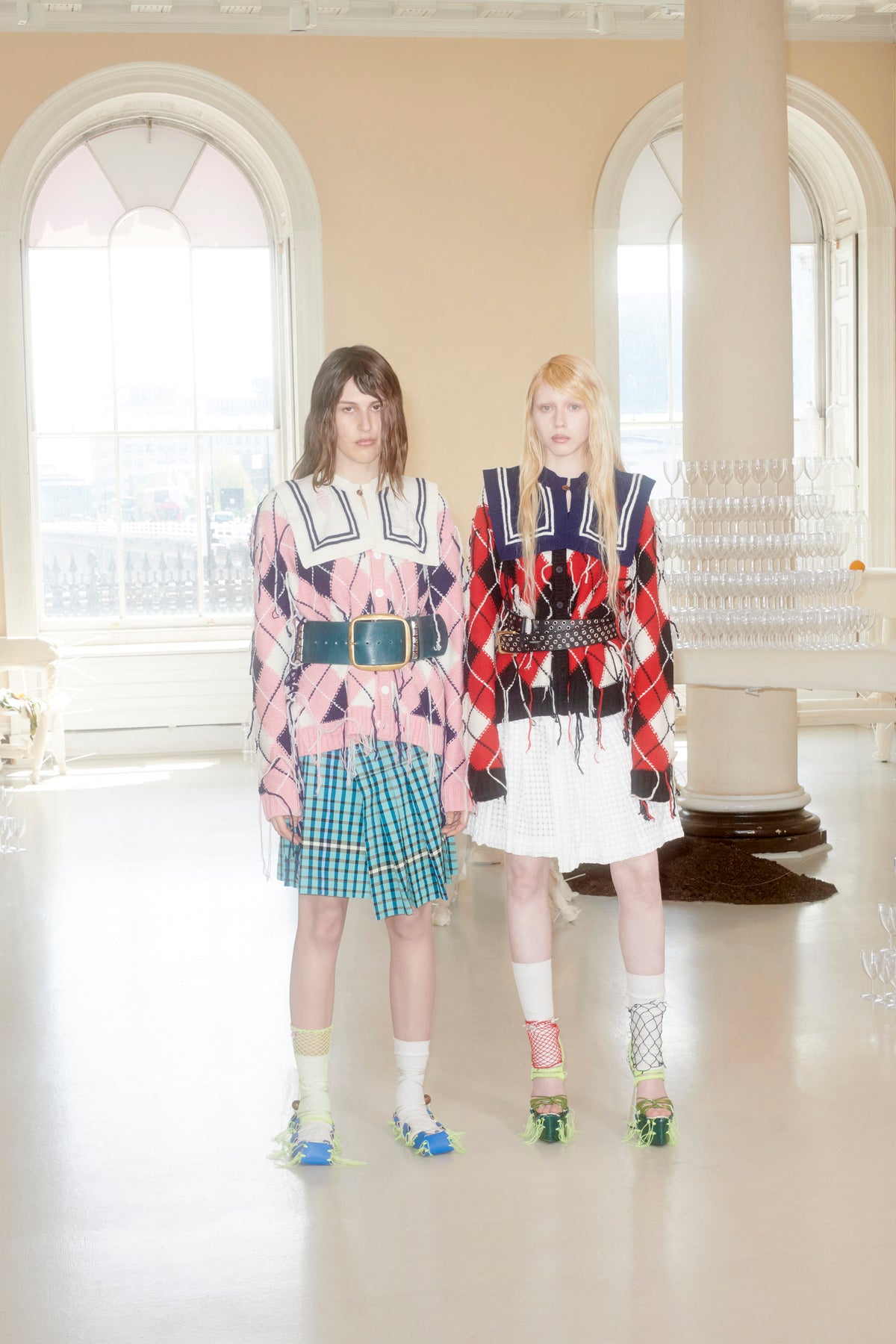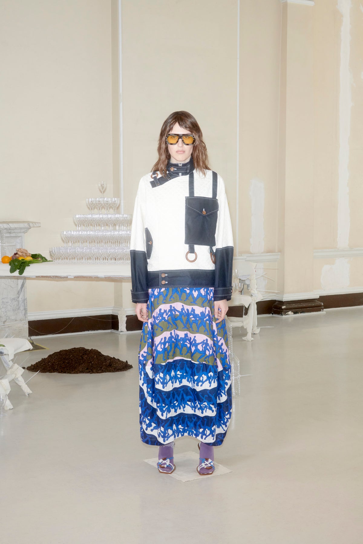 Tailoring, in wool and recycled polyester, is cut with sensuously undulating edges, and comes replete with gender-nonconforming pinstripes and chainmail lining, emboldening the wearer at every turn. Meanwhile, featherlight sheer dresses and ballooning seersucker blouses offer contrasting levity alongside Ancient Greek draping, whilst militaristic adornments are resignified and inverted in wood, providing a gentle critique of the traditionally organised body.
