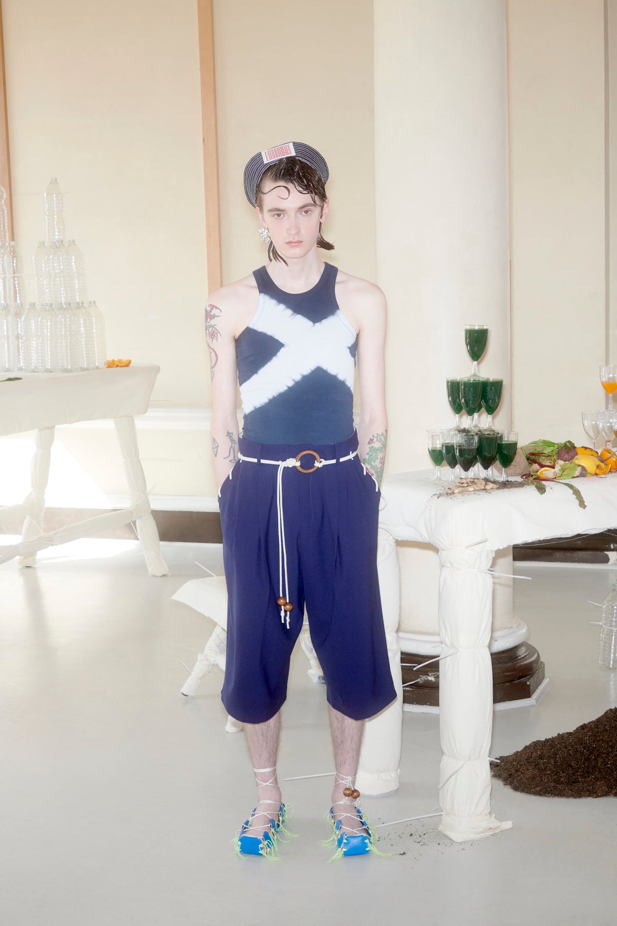 For SS23, LOVERBOY sews all of this multiplicity, all of this beautiful queer contradiction, into its seams. A short film exhibiting the collection, stars pop trailblazers and best friends, Nimmo, whose cathartic, synth heavy music reaches deep into the soul, setting dancefloors alight. We see the pair satirising fashion archetypes – and doing their best exaggerated Charles Jeffrey impressions – immersed in a bacchanalia of wellness, surrounded by LOVERBOY’s cast of beguiling characters.