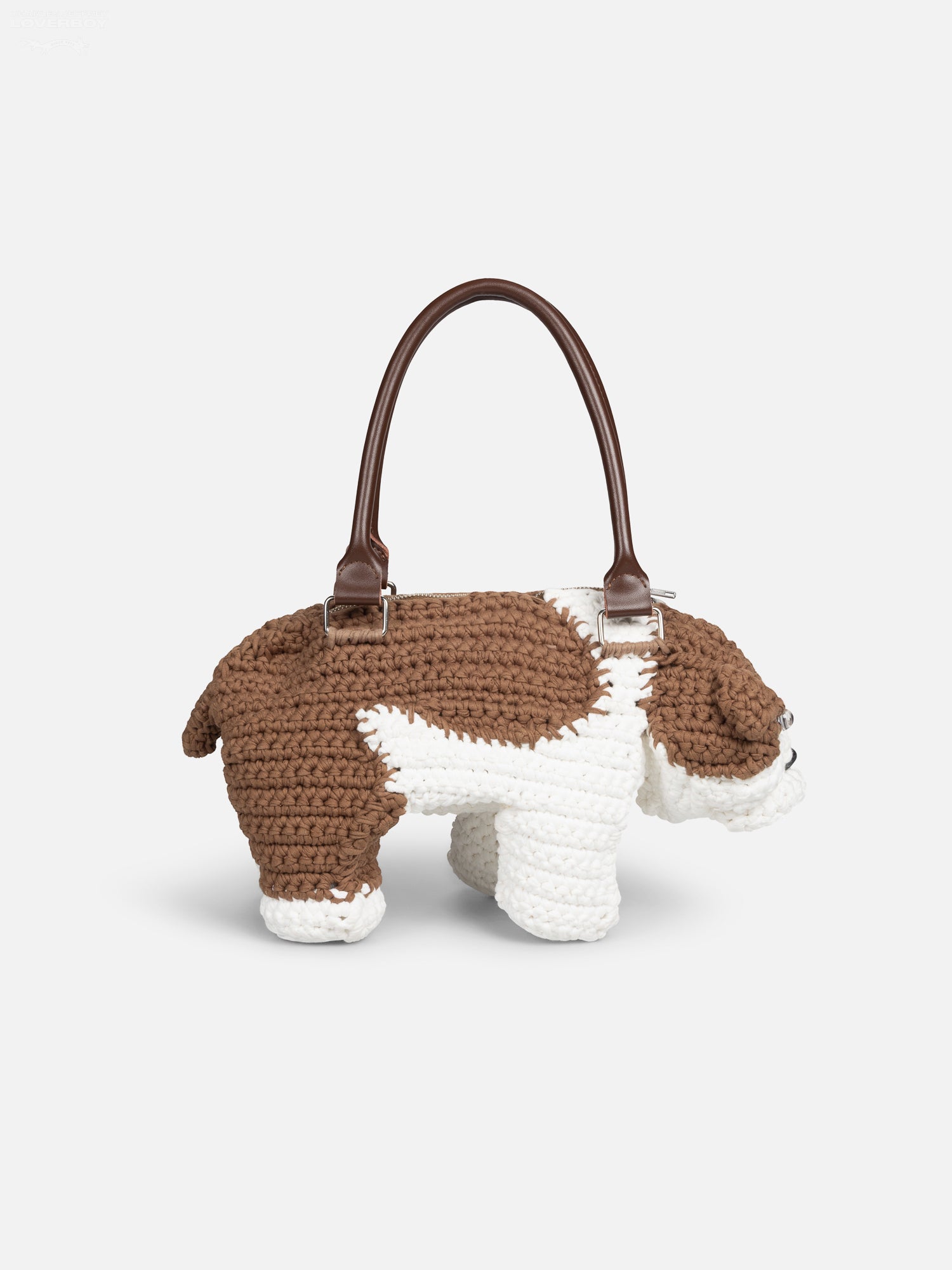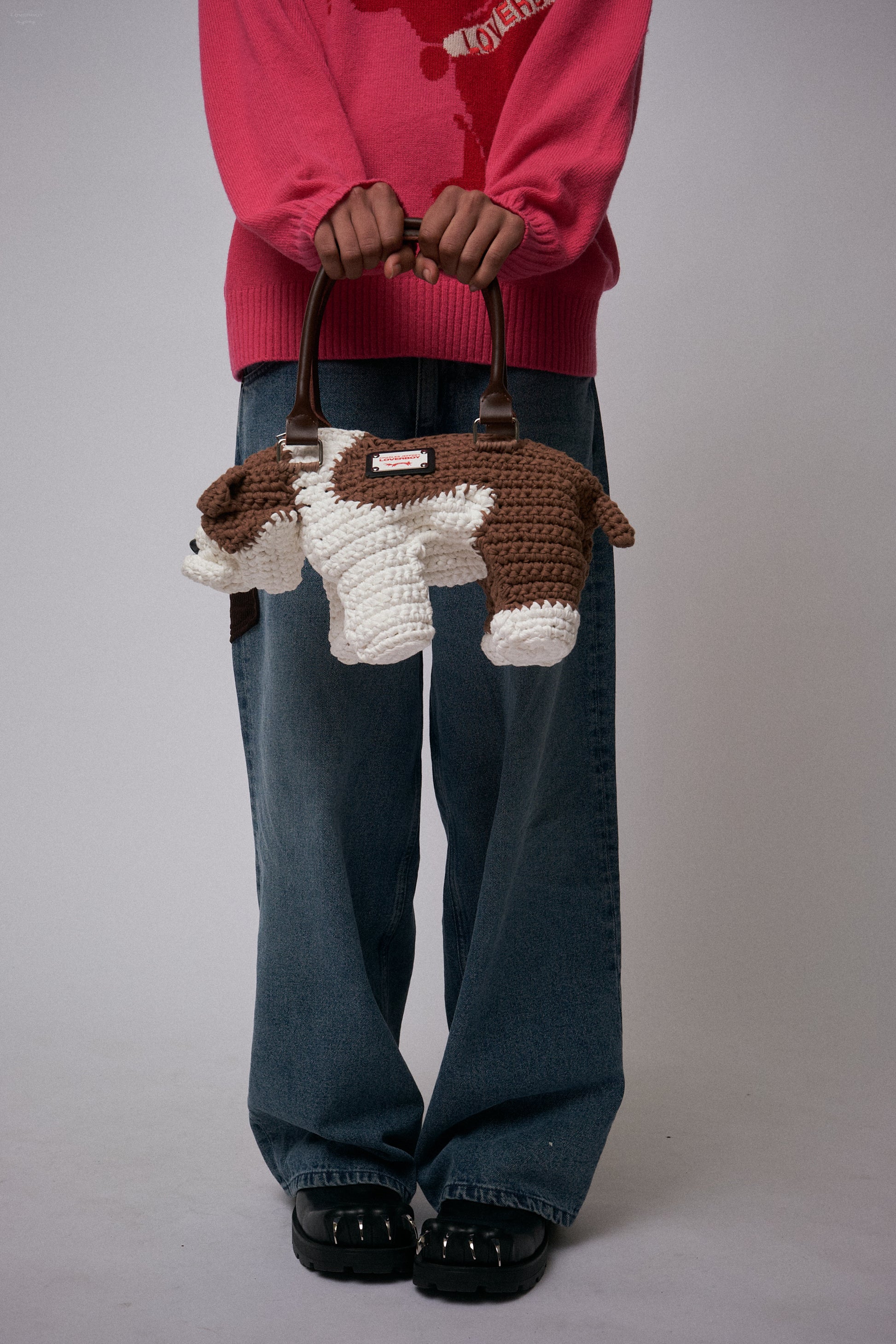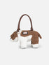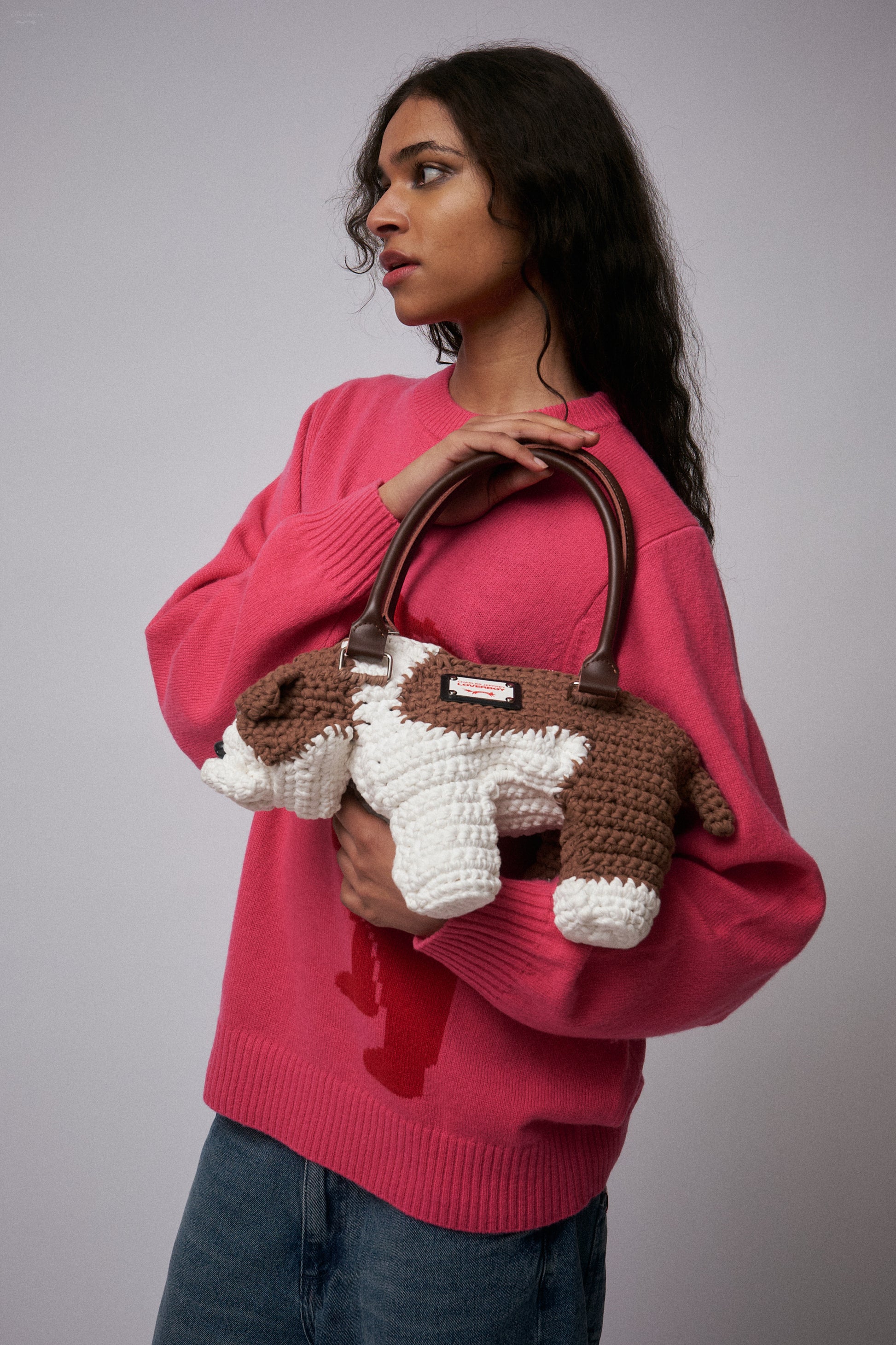 The Bulldog bag is a charming pet of a purse. Knitted from chunky white and tan yarn, he's got a cute, expressive face, and he's finished with a chrome brand plaque and two leather handles.