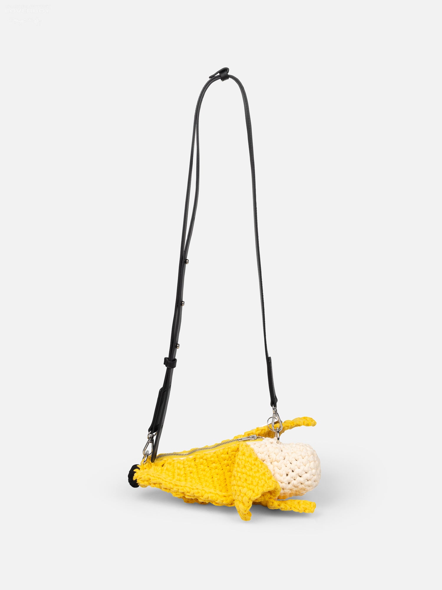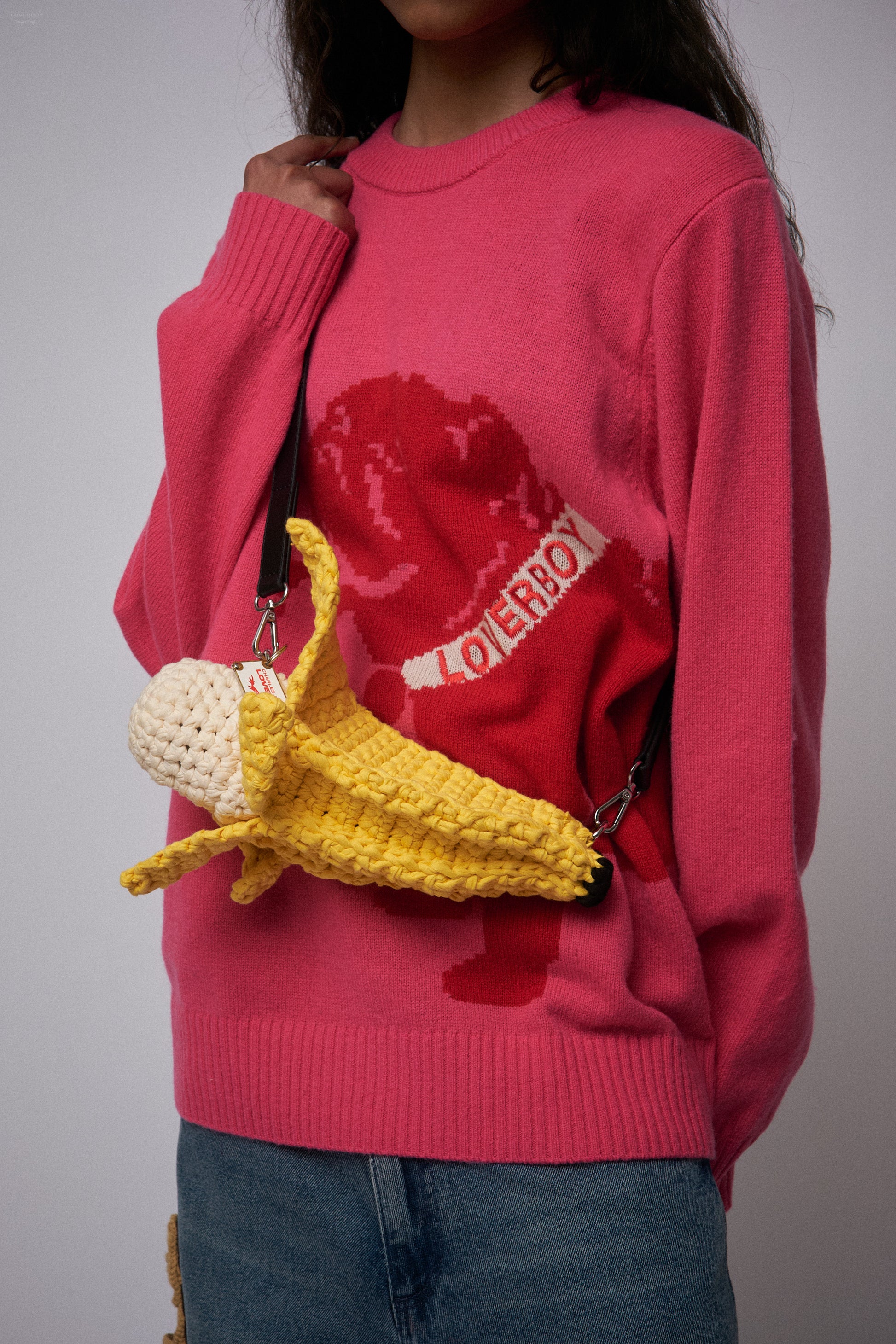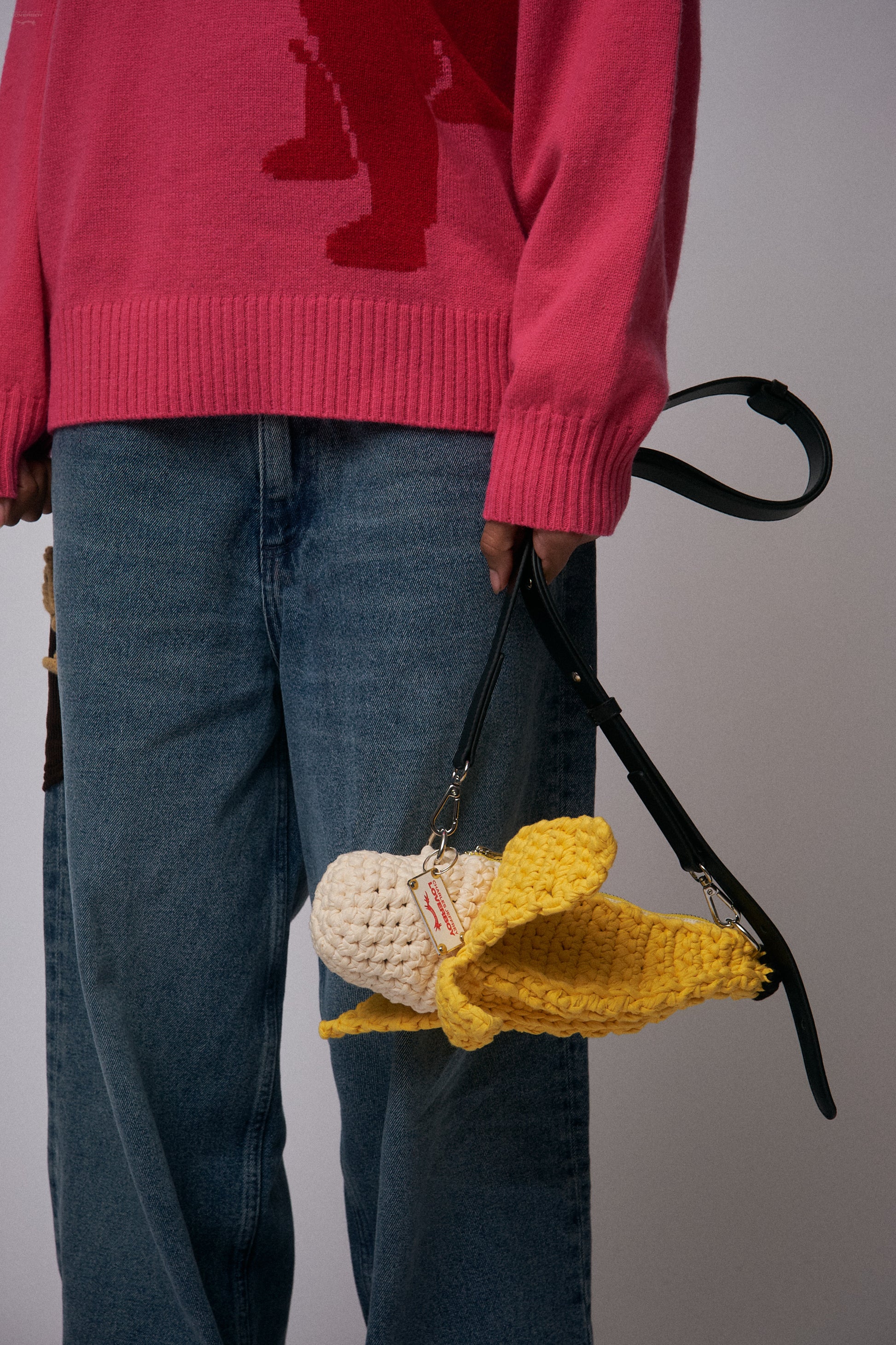 This BAG is BANANAS! No, really. Literally. A banana. A beautiful, knitted LOVERBOY banana bag, trimmed with a sassy leather shoulder strap, ready to make your look even more a-peeling.