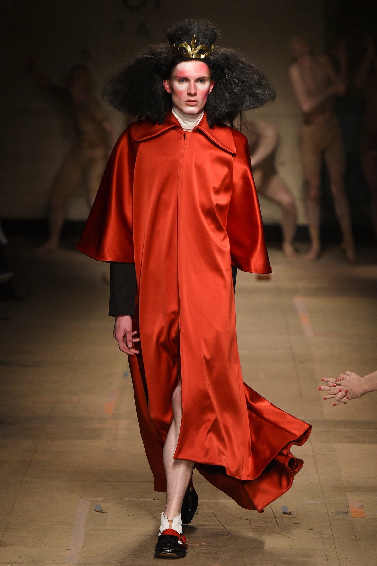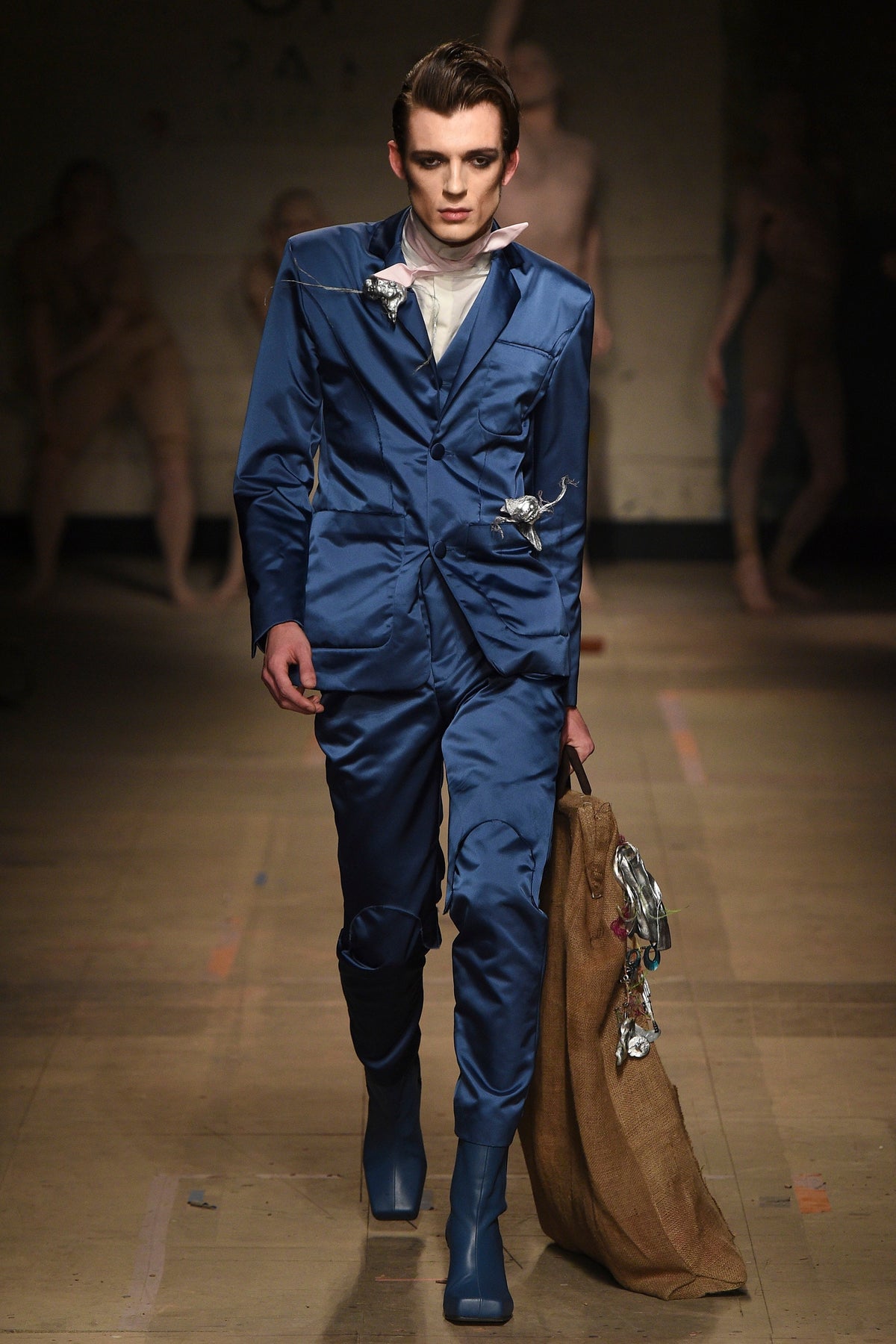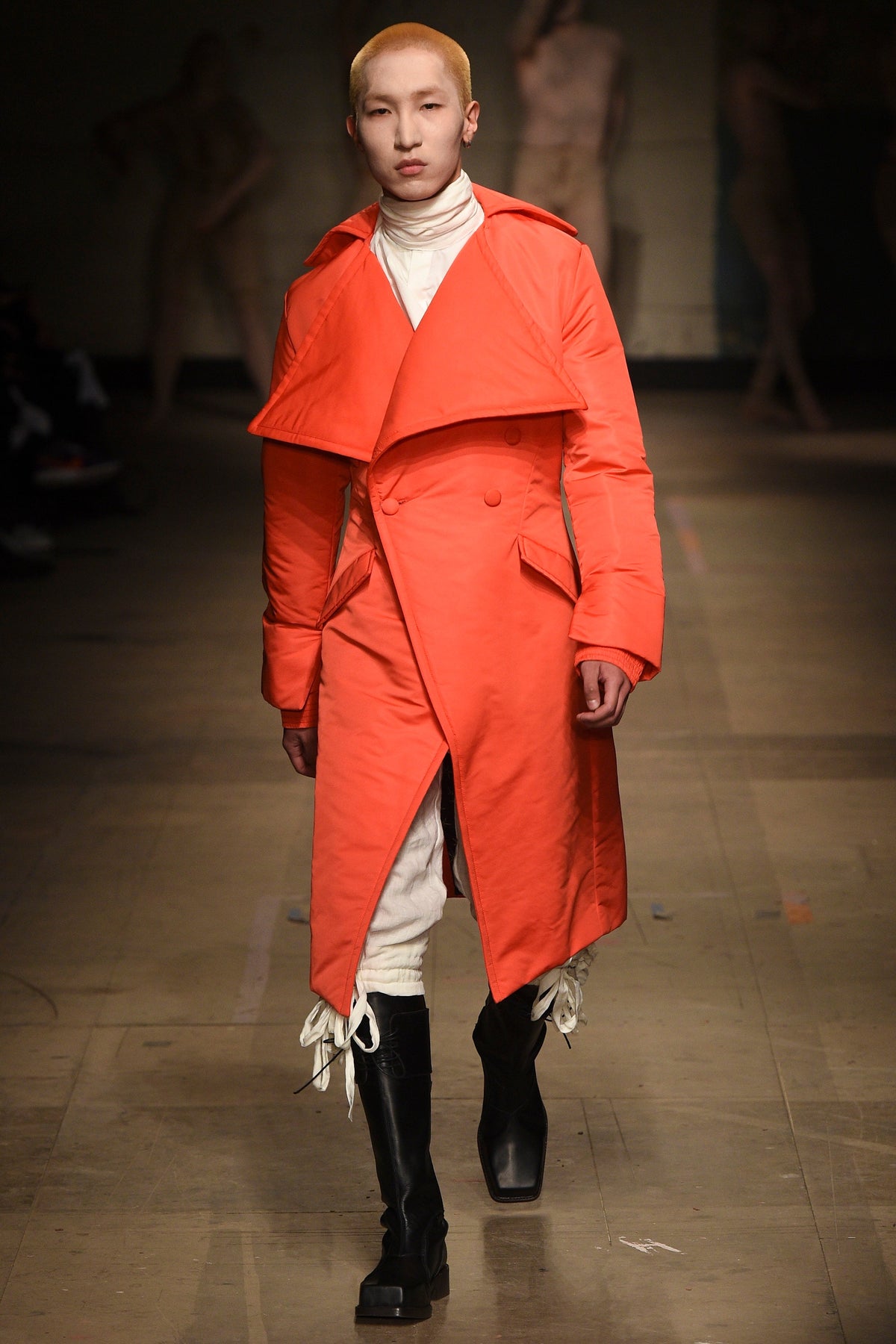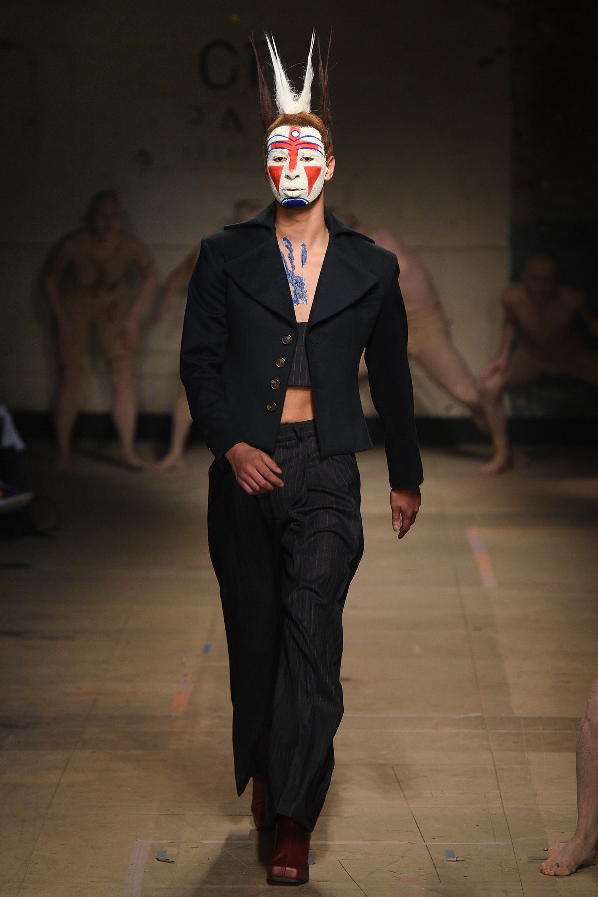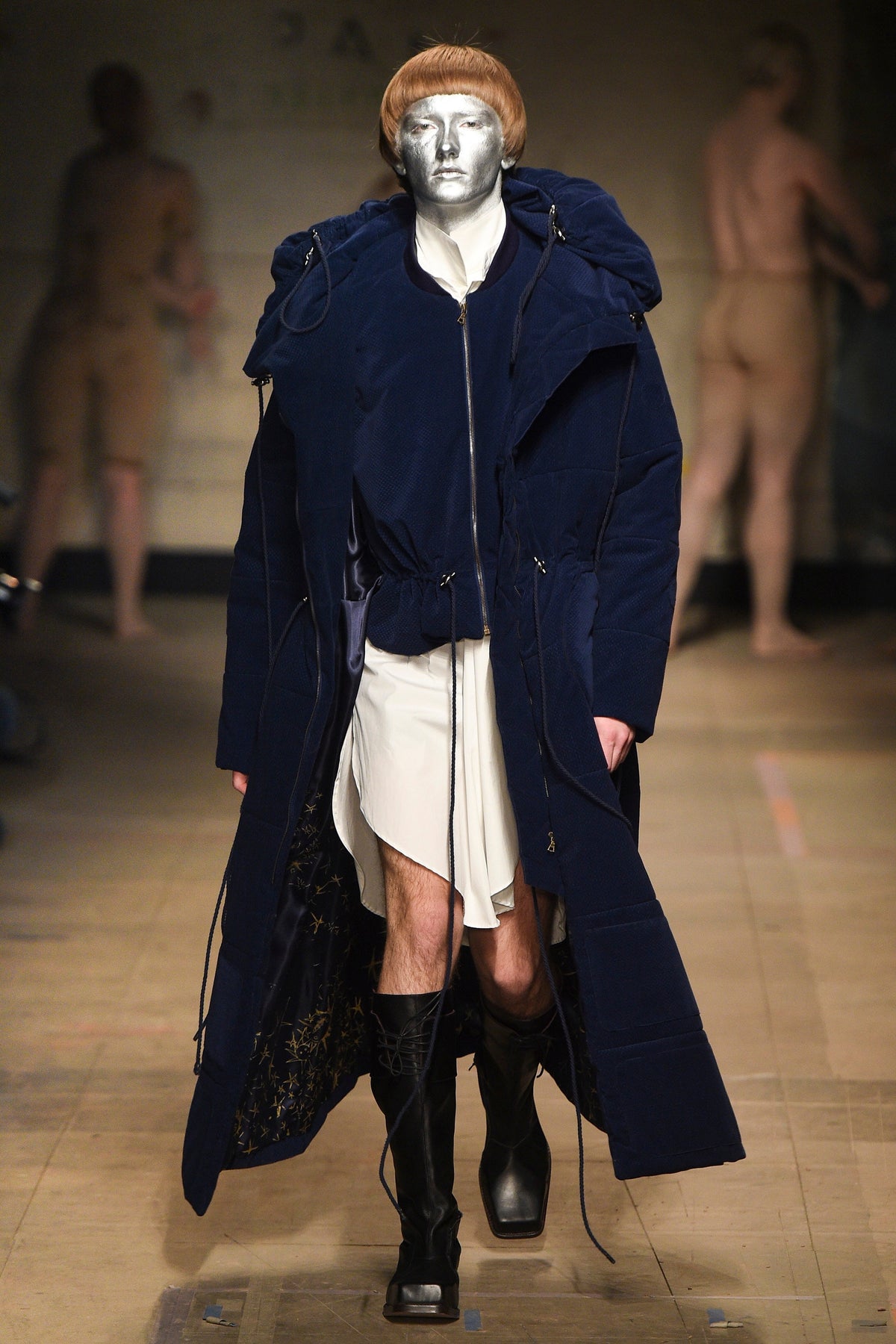 The looks verged from bowl-cut robots in loose parkas to Pictish-ly daubed pagans in 18th-century jackets. The unifying factors were keenly applied tailoring and a rich inventiveness backed up by broad inspiration. The papier-mâché monstrosities—one of them painted with an amalgam of Union Jack and Stars and Stripes—that represented the passing of each of Jeffrey’s four acts will be catnip to the “What Madness Is This” brigade (Jeffrey was trolling). This was fantastic freakery for a time that needs it—a barmy alignment of ostentatious disarray and focused creativity.