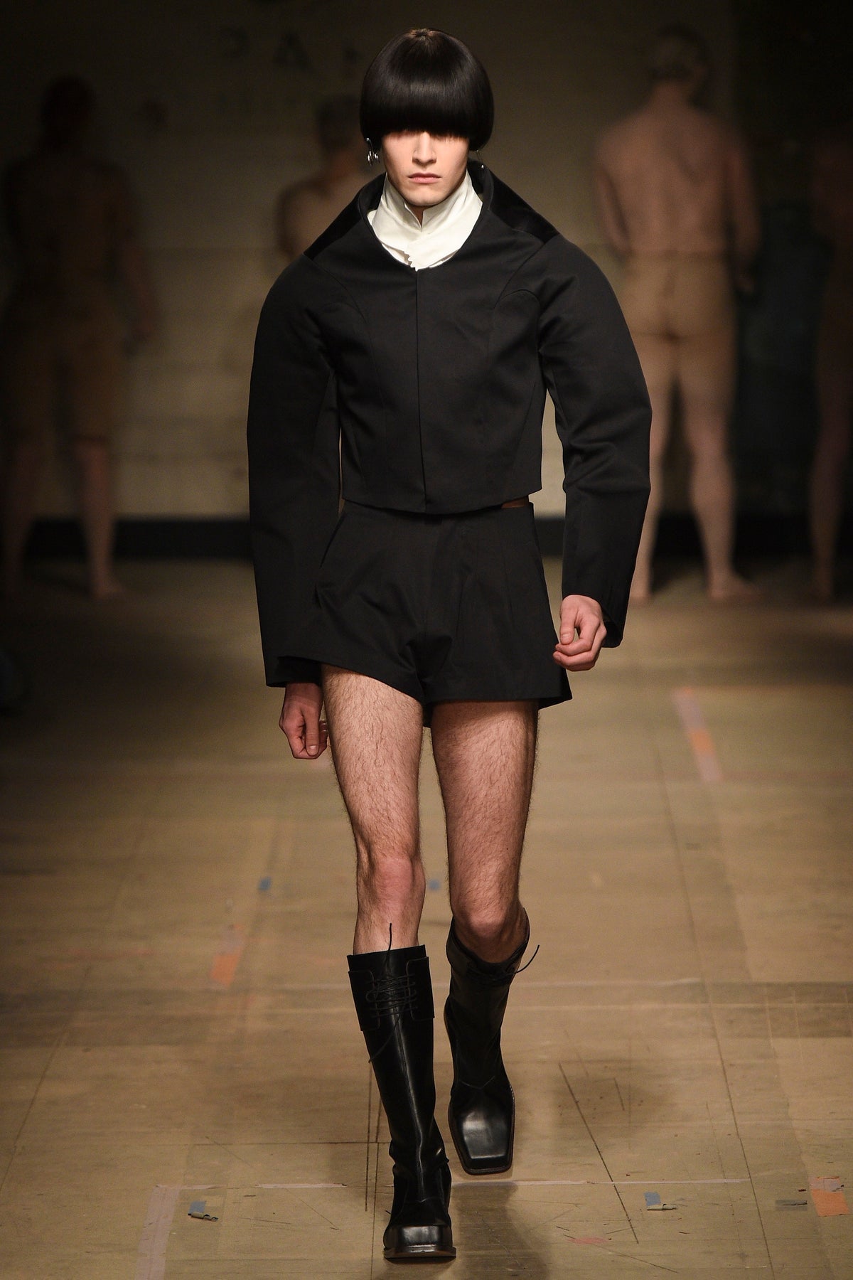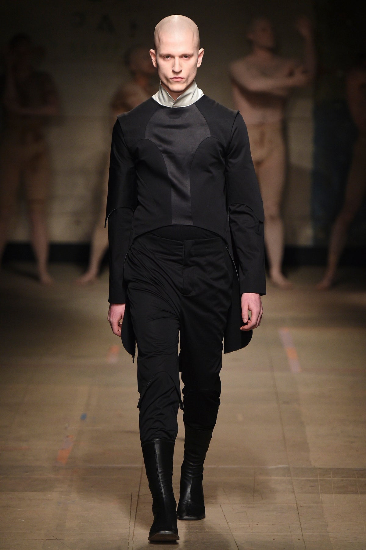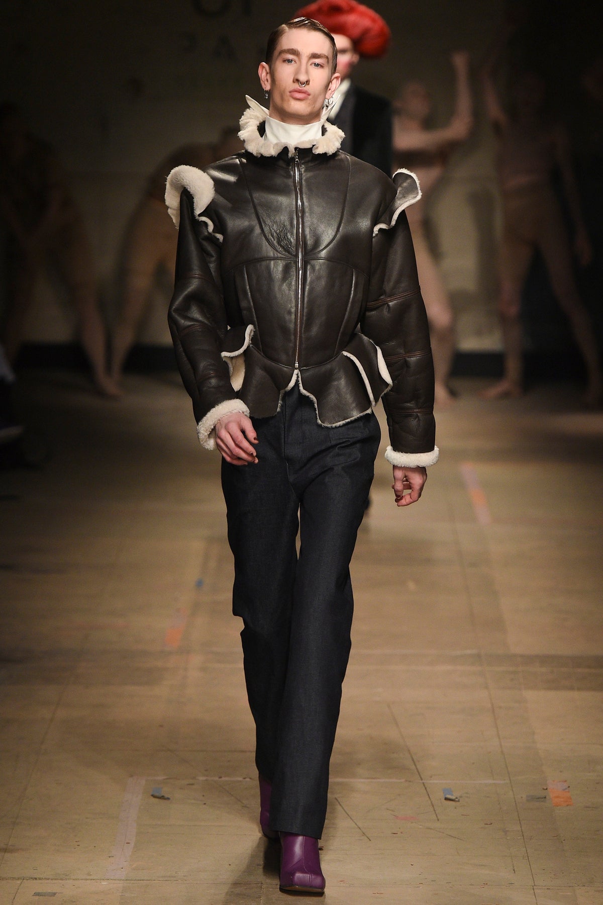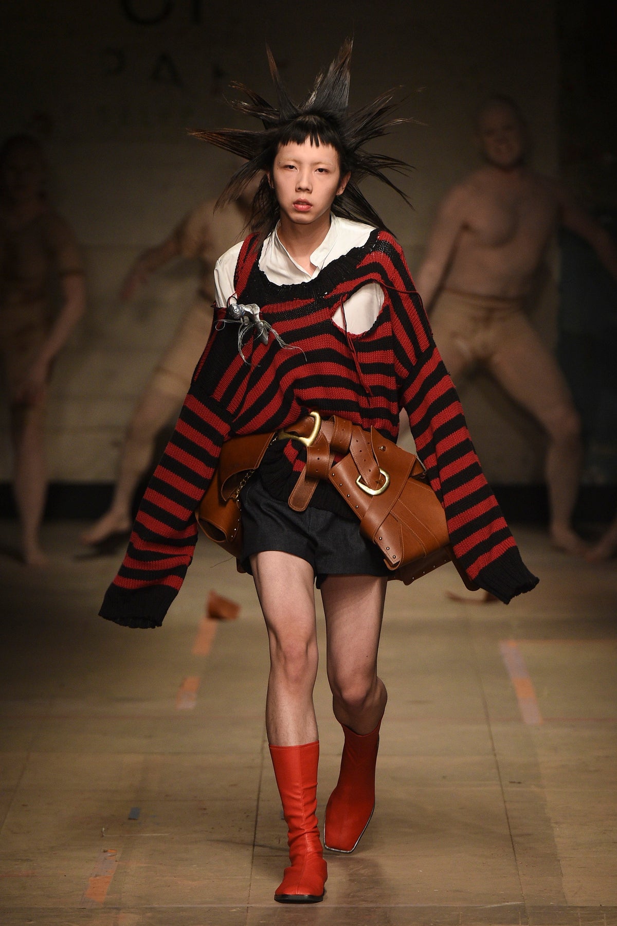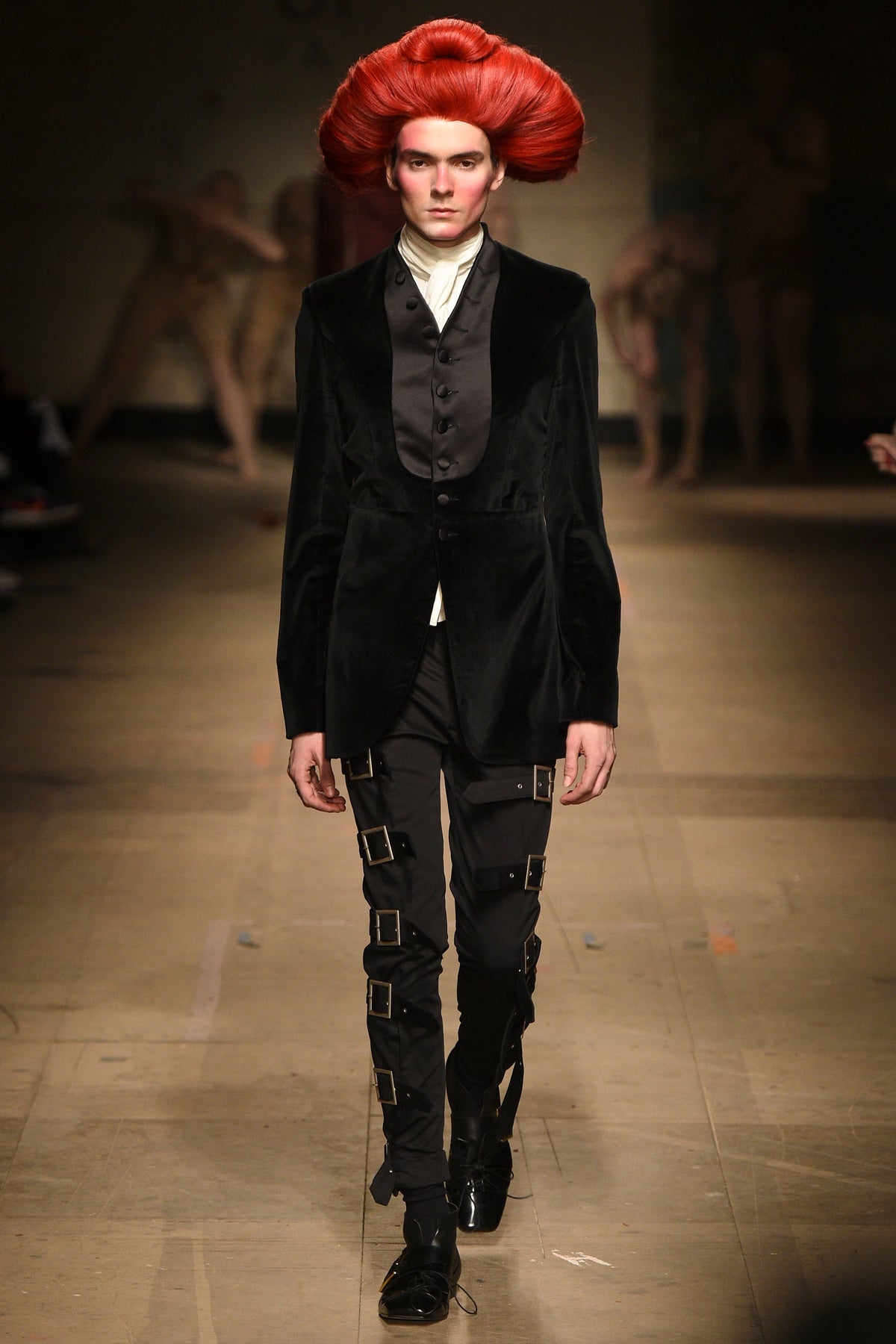 The looks verged from bowl-cut robots in loose parkas to Pictish-ly daubed pagans in 18th-century jackets. The unifying factors were keenly applied tailoring and a rich inventiveness backed up by broad inspiration. The papier-mâché monstrosities—one of them painted with an amalgam of Union Jack and Stars and Stripes—that represented the passing of each of Jeffrey’s four acts will be catnip to the “What Madness Is This” brigade (Jeffrey was trolling). This was fantastic freakery for a time that needs it—a barmy alignment of ostentatious disarray and focused creativity.