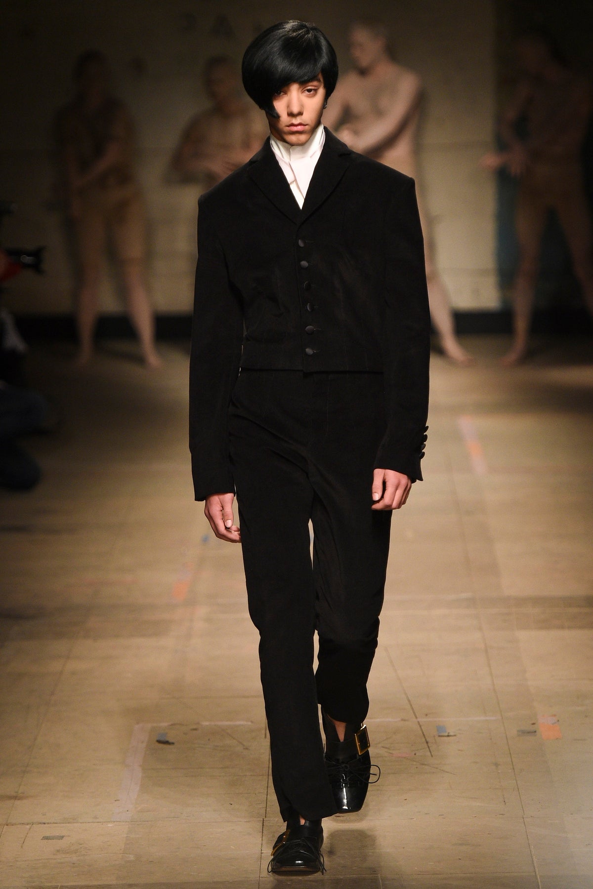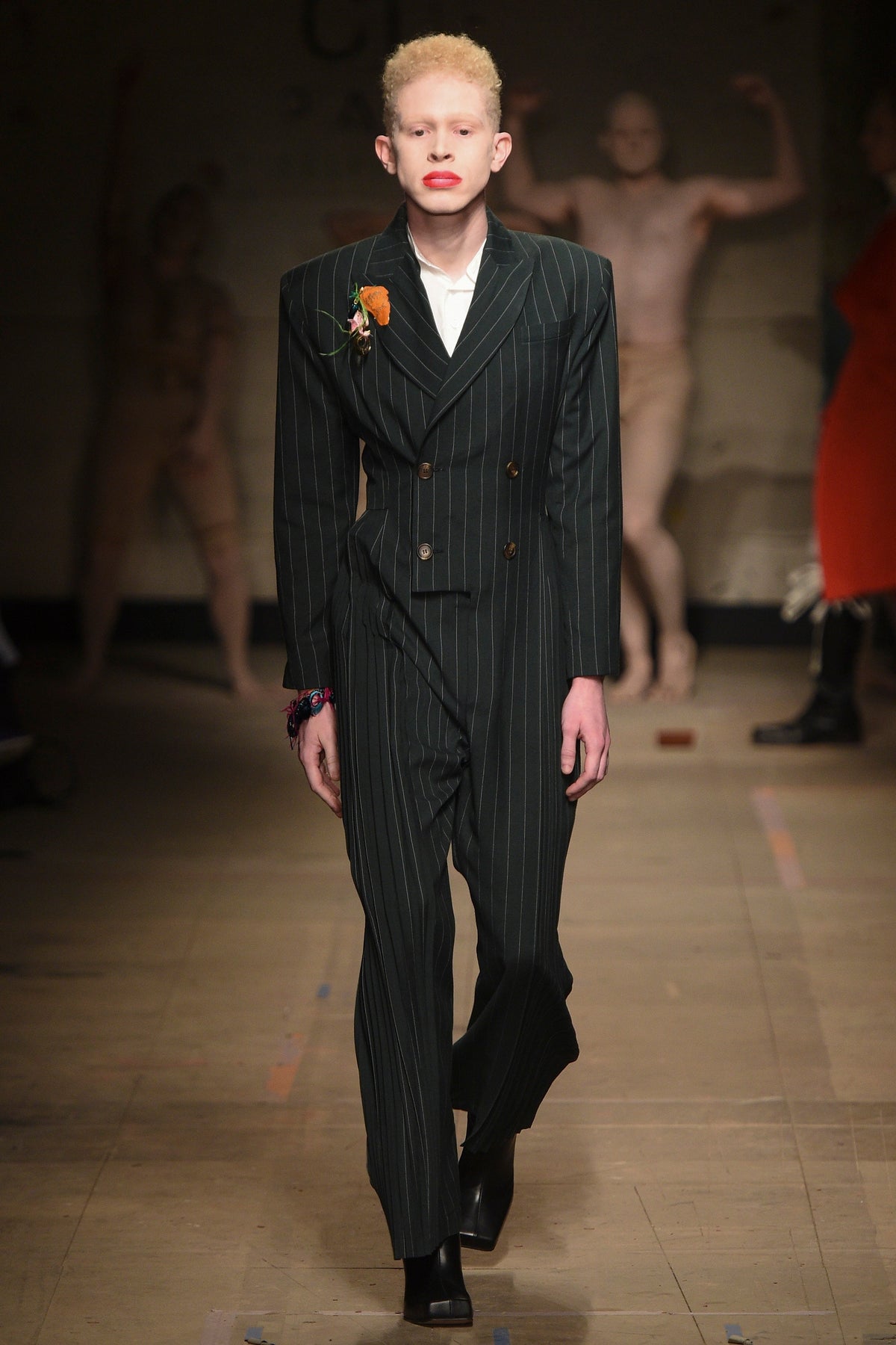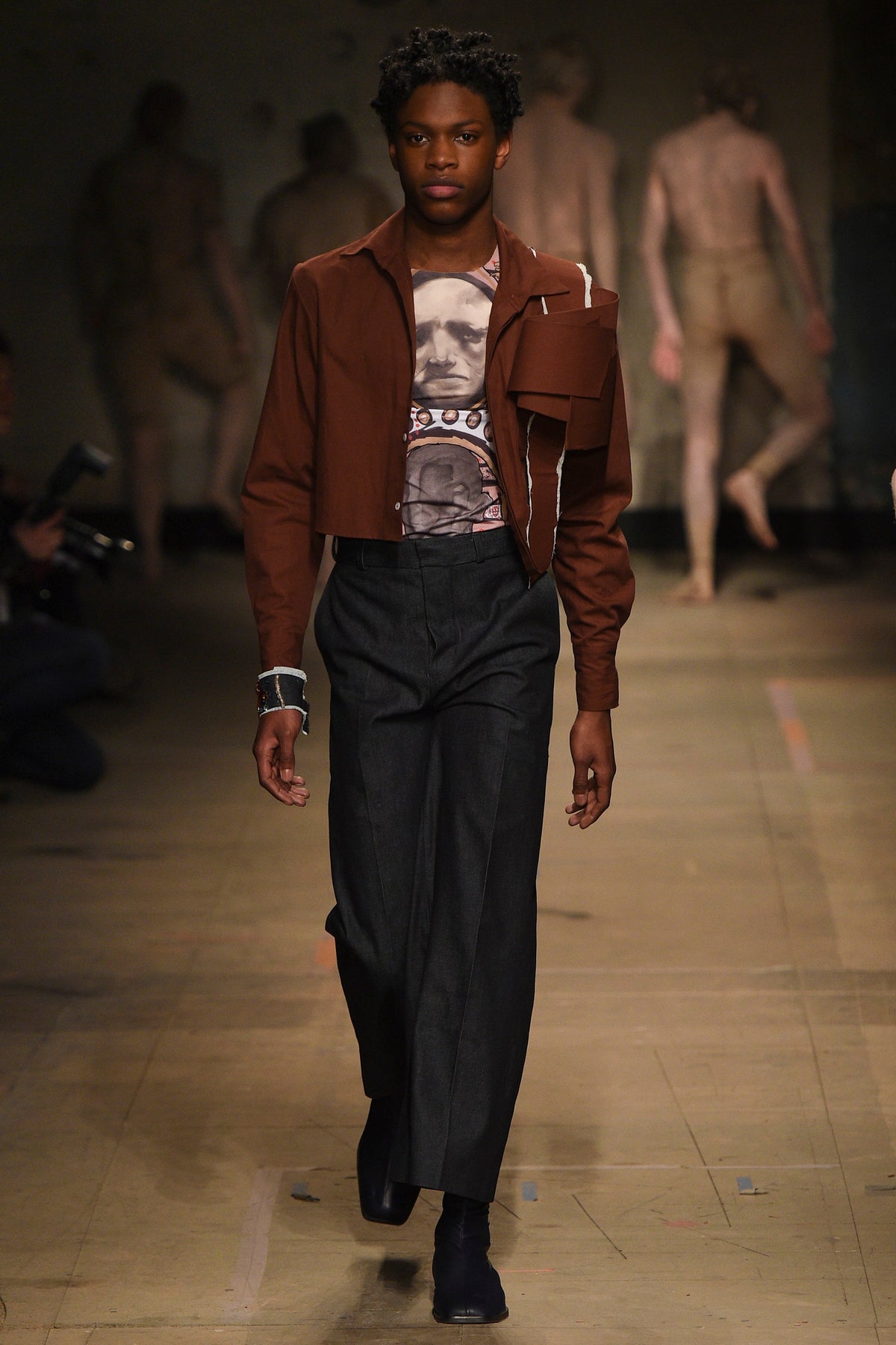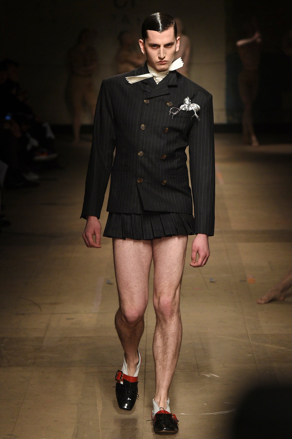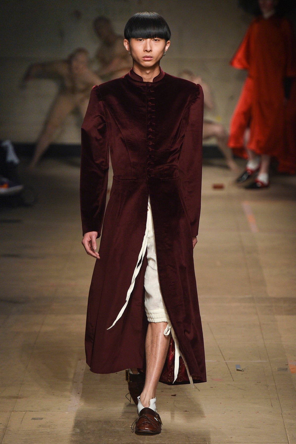 The looks verged from bowl-cut robots in loose parkas to Pictish-ly daubed pagans in 18th-century jackets. The unifying factors were keenly applied tailoring and a rich inventiveness backed up by broad inspiration. The papier-mâché monstrosities—one of them painted with an amalgam of Union Jack and Stars and Stripes—that represented the passing of each of Jeffrey’s four acts will be catnip to the “What Madness Is This” brigade (Jeffrey was trolling). This was fantastic freakery for a time that needs it—a barmy alignment of ostentatious disarray and focused creativity.
