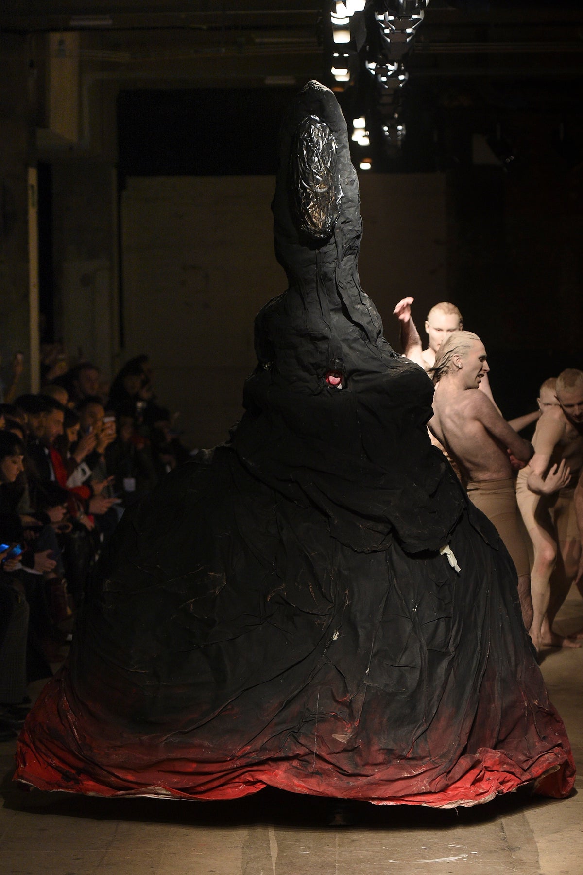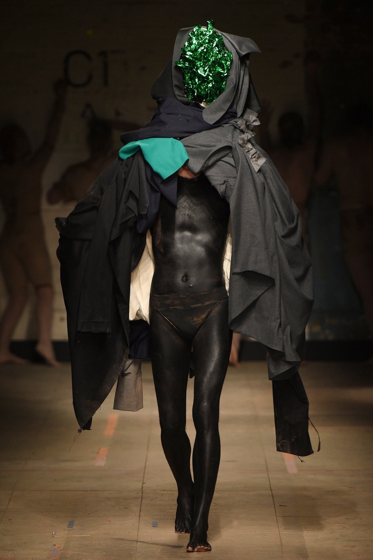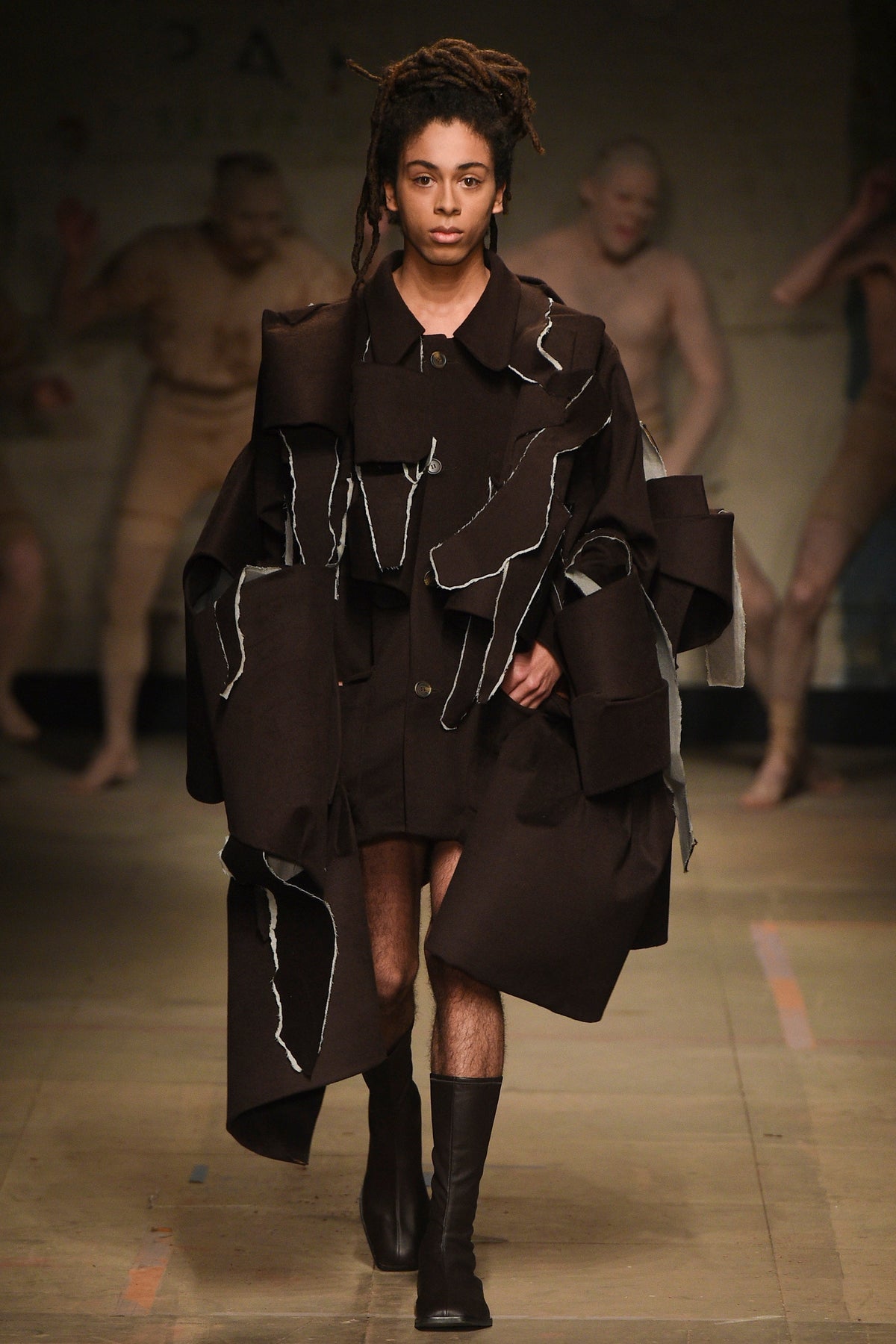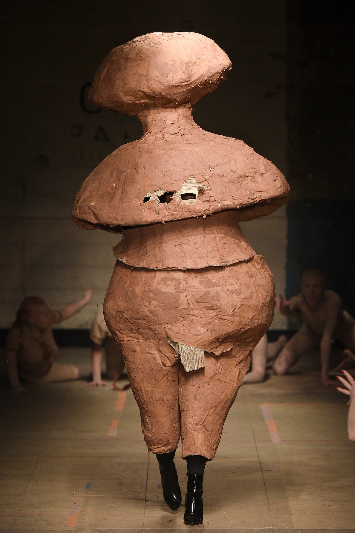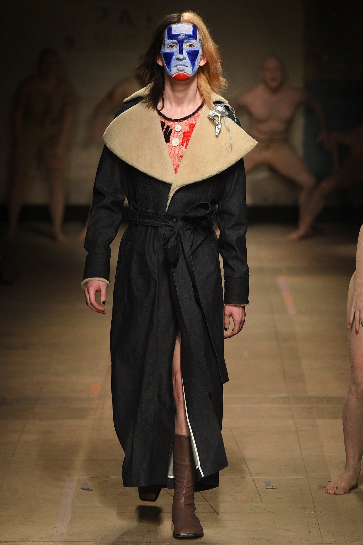 To begin, a clay-caked dance troupe emerged from the darkness, at first unsure as if they’d lost their way mid-body wrap at the Selfridges spa upstairs. As this chorus stomped, preened, and gurned, a costume drama of characters in four acts walked around them.