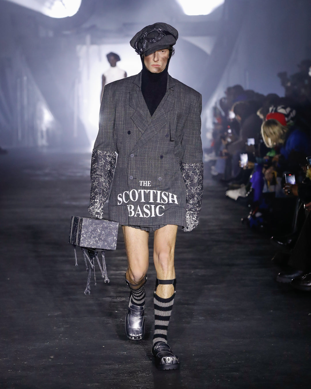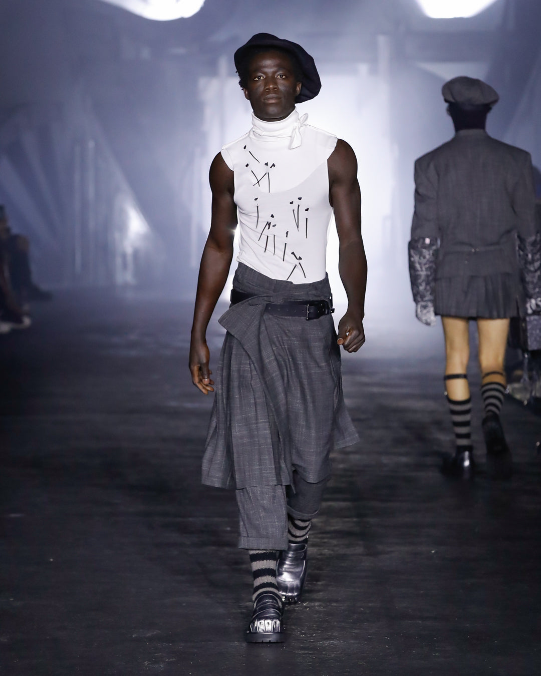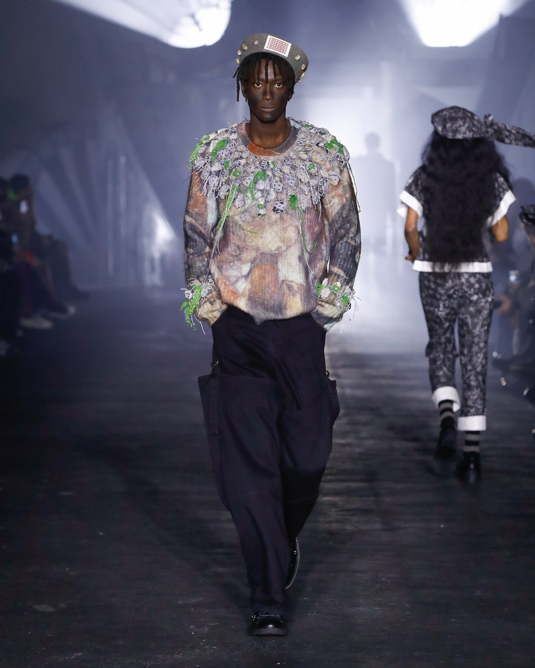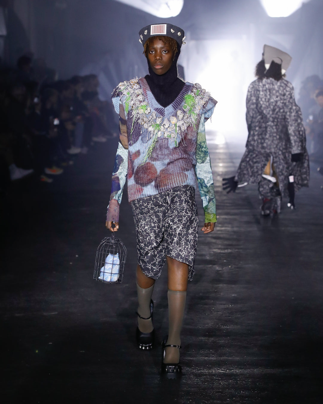 First we meet the Workers. Bedecked in warm layers, protective gear and reworked staples, their outfits reflect their arduous conditions they endure. Unexpected embellishments recall the trinkets made by magpie-eyed mudlarkers, highlighting the Workers’ ingenuity in the face of adversity.