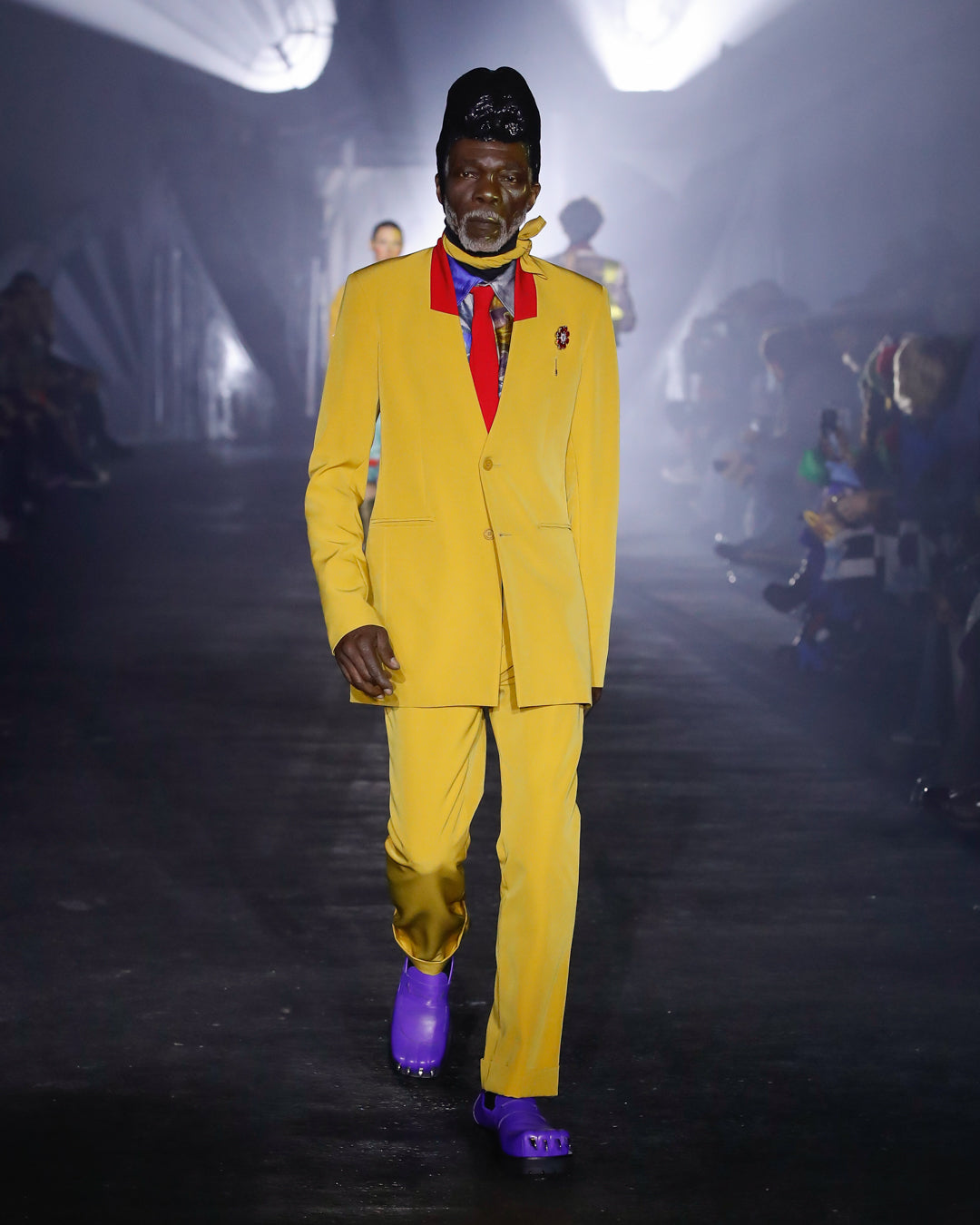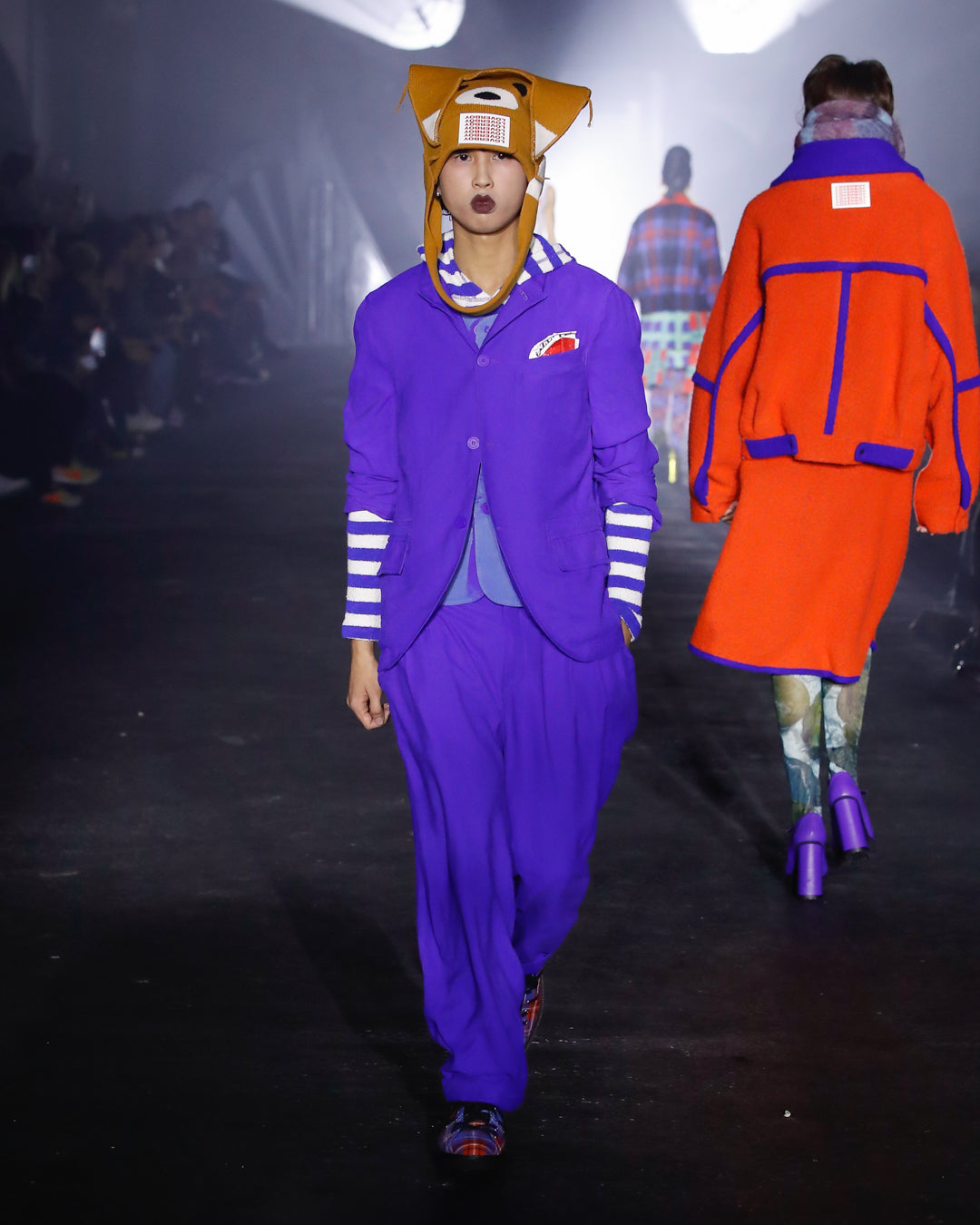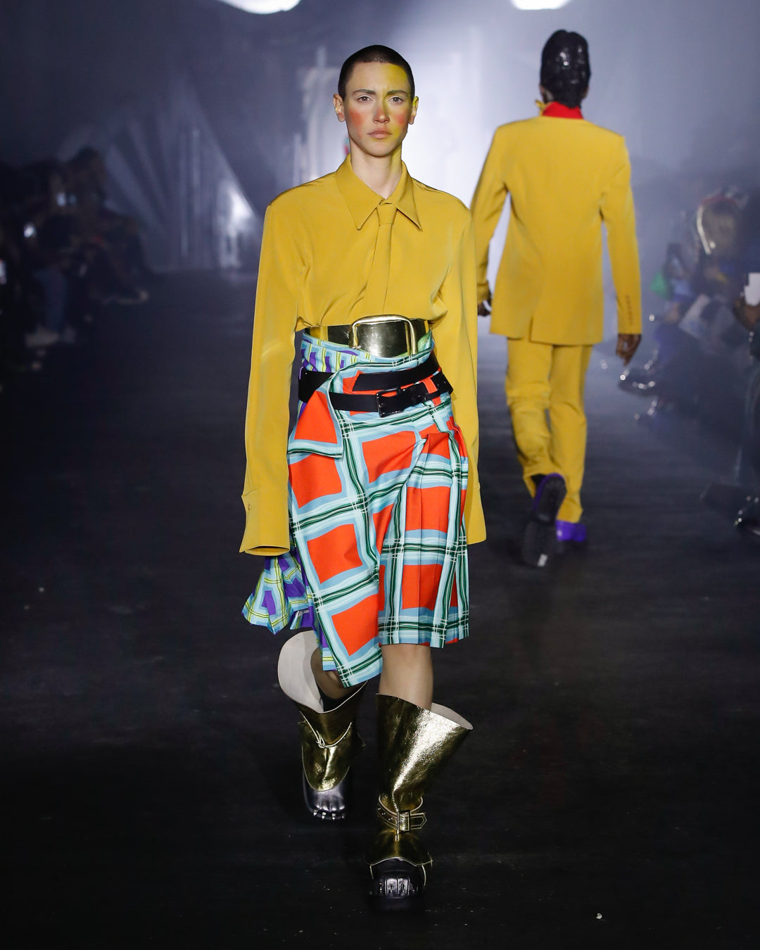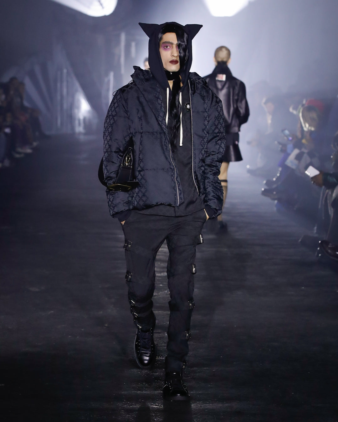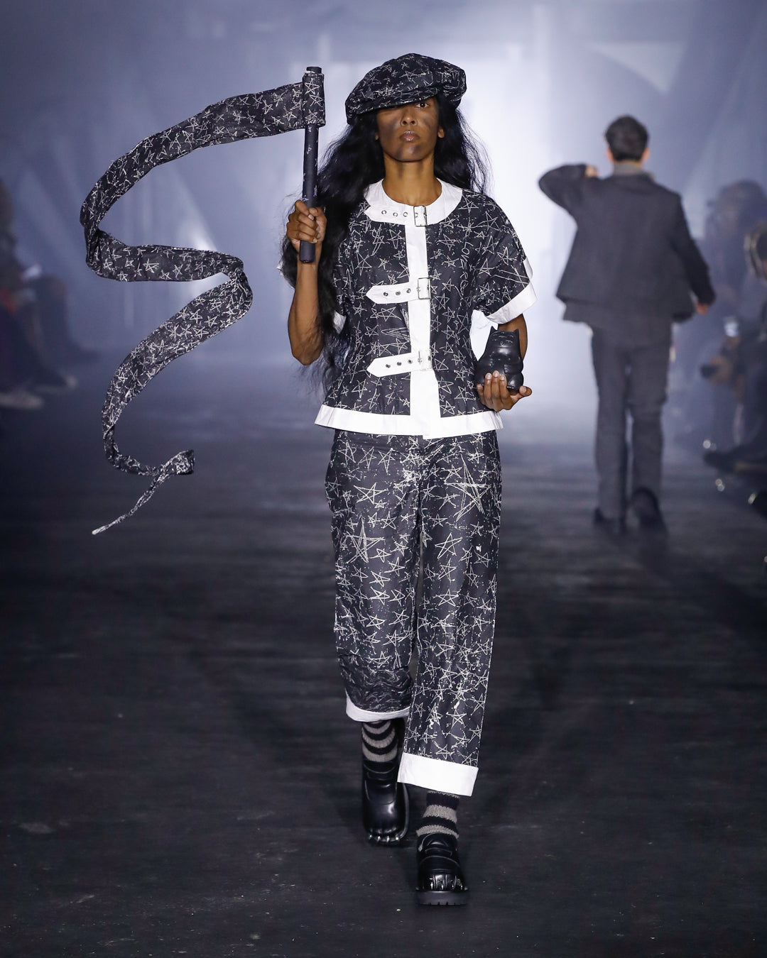 Part two introduces us to the Posers, former workers who now set the sartorial agenda in Ajuka, populating the city’s many luxury boutiques. Sleek tailoring, oversized ruffles and ornate prints characterise their clothing, alongside fearsome, claw-footed footwear.