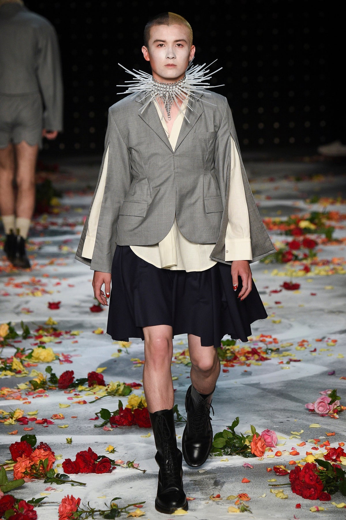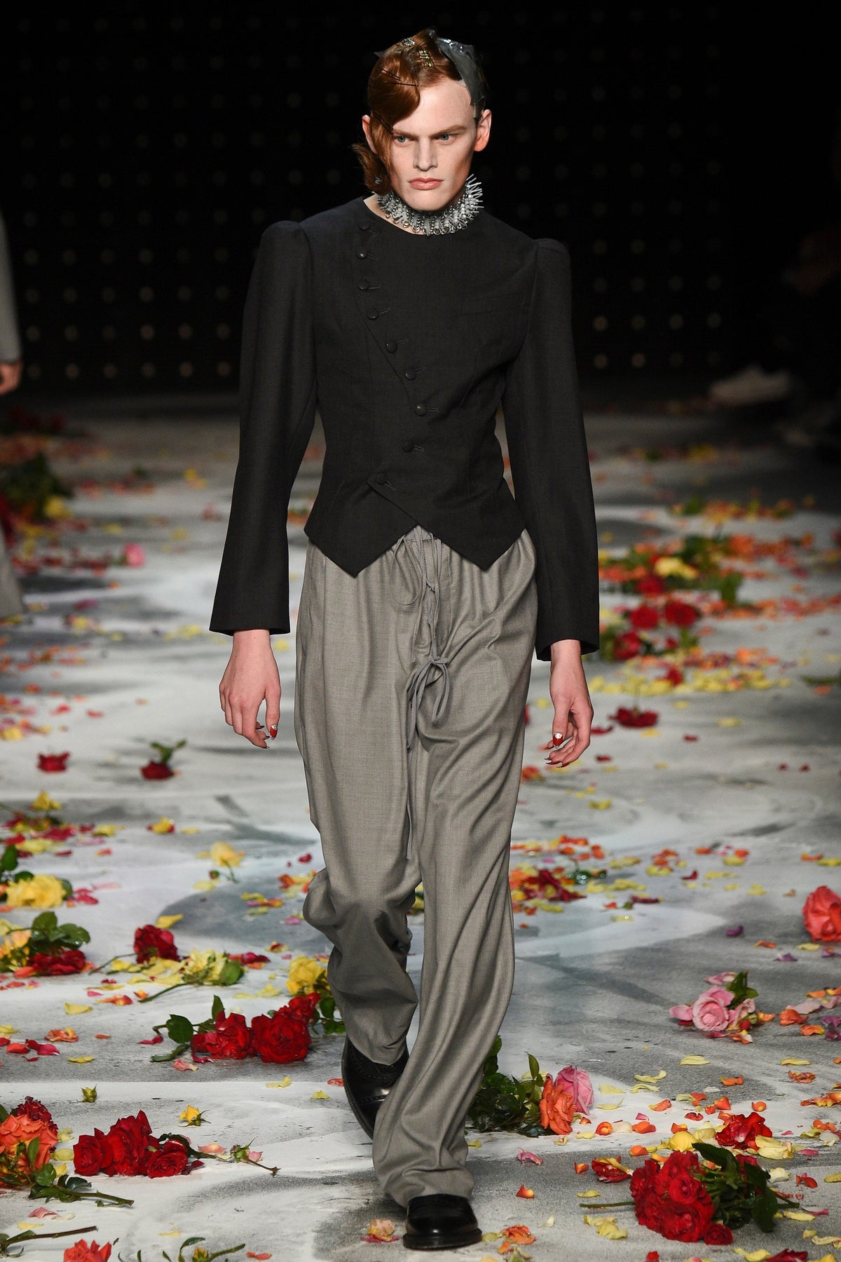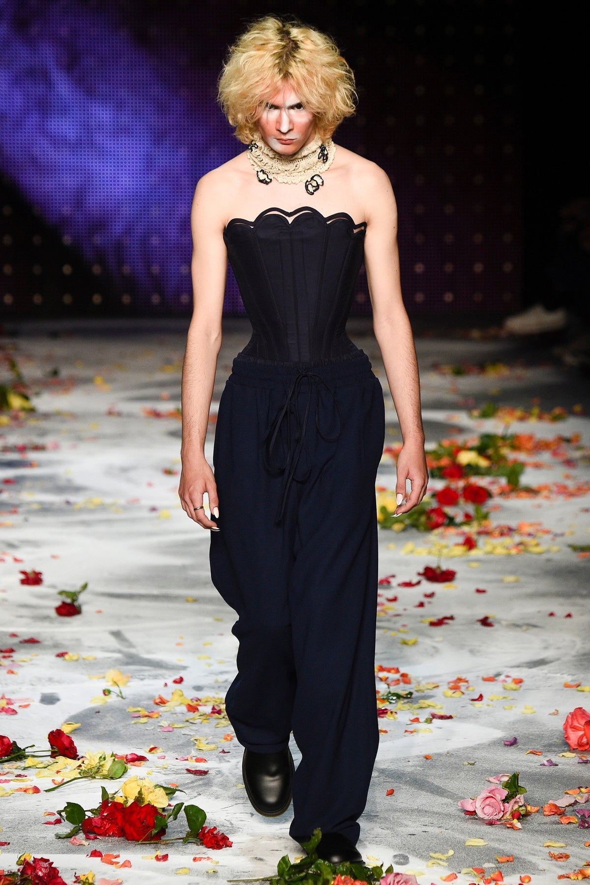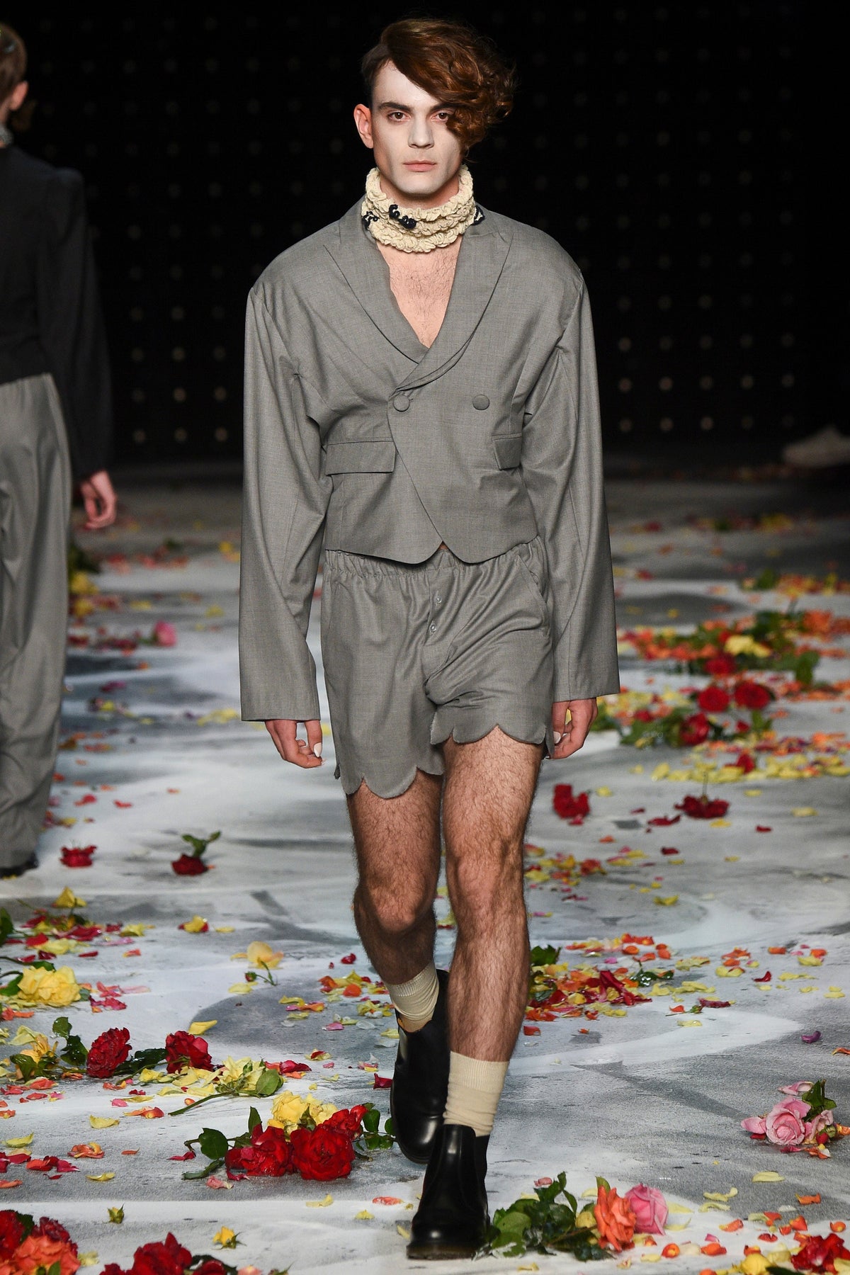 Finally to Charles Jeffrey’s LOVERBOY label (his capitals), which used the darkness of inter-designer intermission to heap the runway with flower petals. Any collection that includes a pair of boxer shorts with integrated sink-plug filter and shower tube is surely worth a second look. This one did—which was good. Because at first look, thanks in part to the arresting casting, this felt at times like a look-at-me tribute to Taboo for anachronistic chronic attention addicts. Beneath the histrionics, however, was playful fashion historicism. Jeffrey seized upon the munificence of Woolmark to incorporate fine tailoring fabrics into interesting inversions and subversions of past-period garments from Regency ruffle collars to sleeveless New Look jackets. A scallop-edged corset worn over utterly unrefined track pants was a typical epoch-clashing ensemble. Time-traveling, gender-explorational attire for extravagantly inclined Doctor Ooh-look-at-that-guy guys.