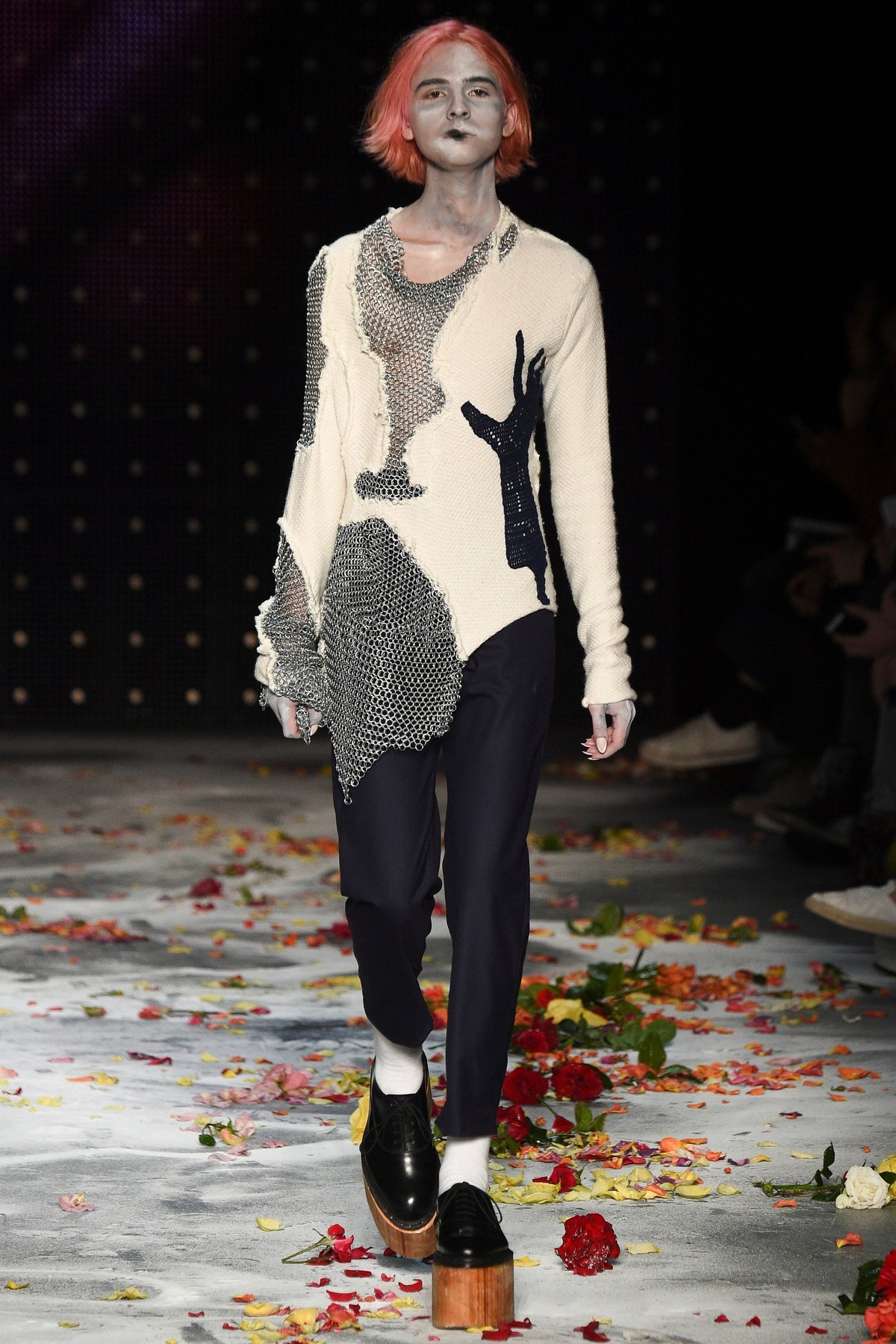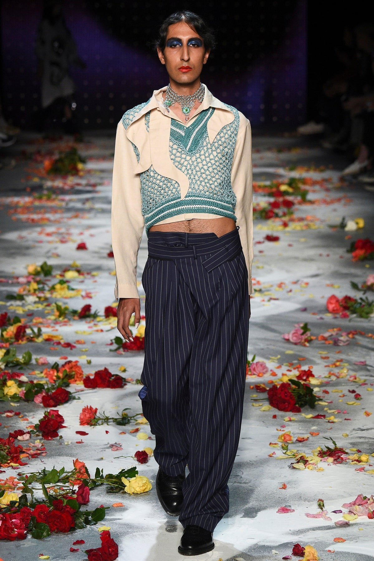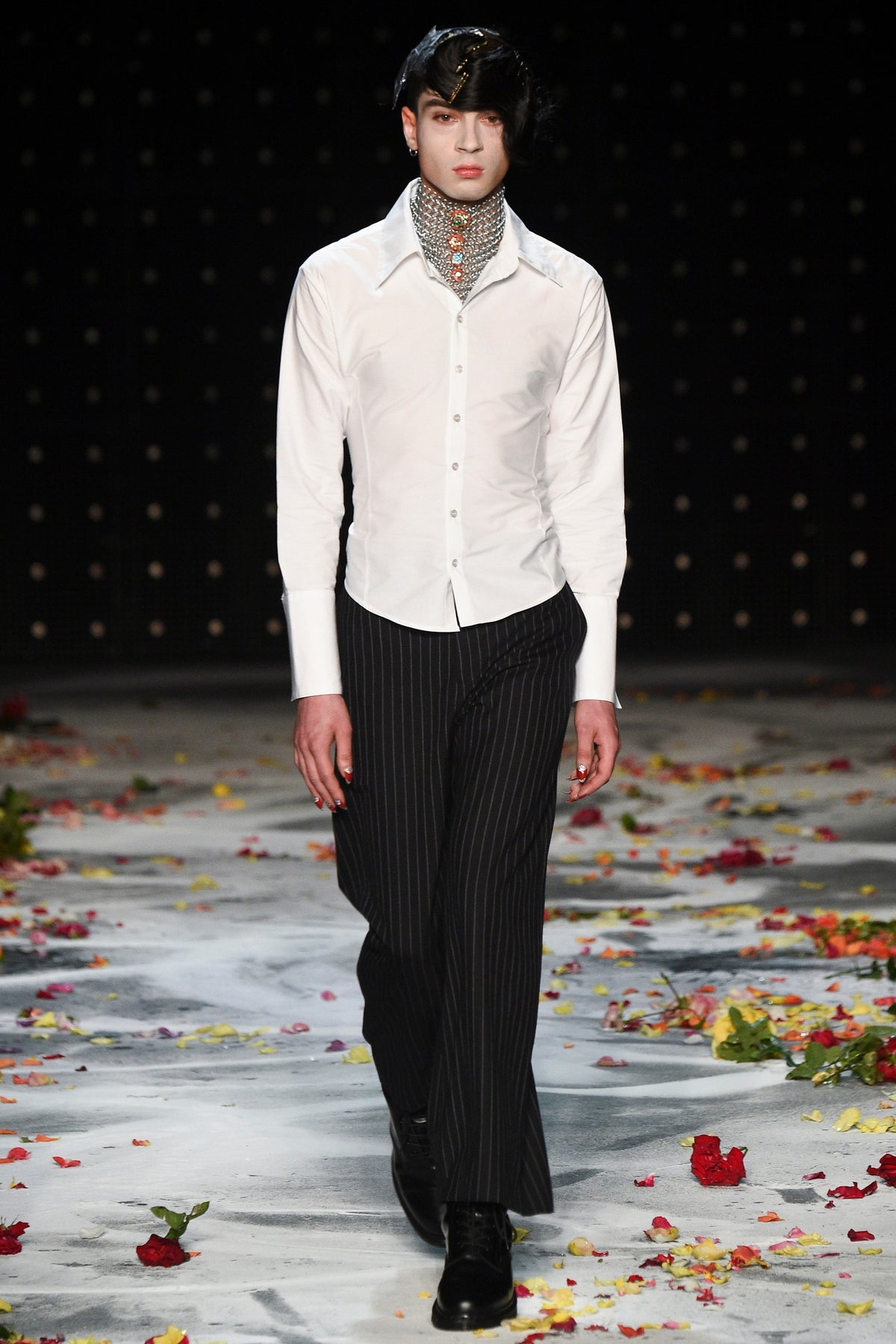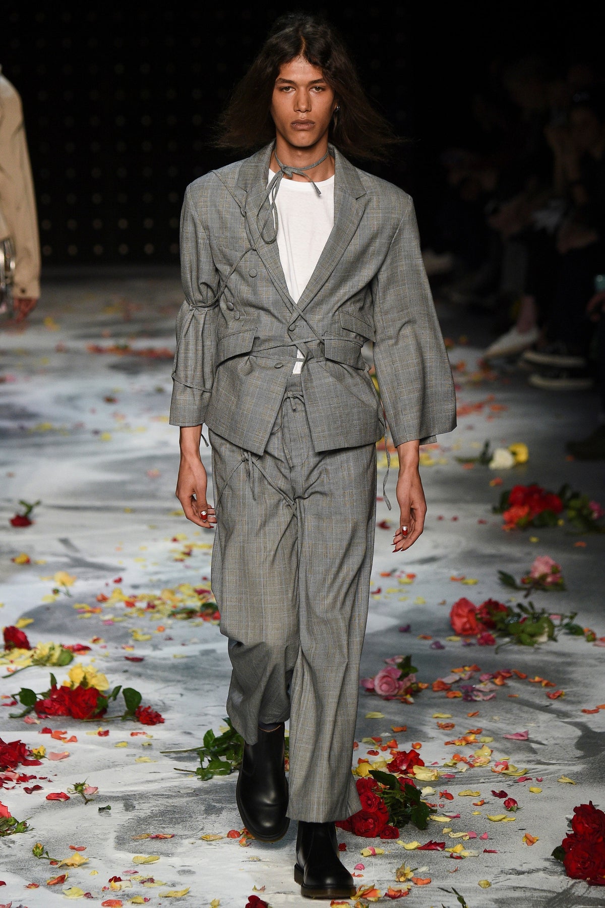 Finally to Charles Jeffrey’s LOVERBOY label (his capitals), which used the darkness of inter-designer intermission to heap the runway with flower petals. Any collection that includes a pair of boxer shorts with integrated sink-plug filter and shower tube is surely worth a second look. This one did—which was good. Because at first look, thanks in part to the arresting casting, this felt at times like a look-at-me tribute to Taboo for anachronistic chronic attention addicts. Beneath the histrionics, however, was playful fashion historicism. Jeffrey seized upon the munificence of Woolmark to incorporate fine tailoring fabrics into interesting inversions and subversions of past-period garments from Regency ruffle collars to sleeveless New Look jackets. A scallop-edged corset worn over utterly unrefined track pants was a typical epoch-clashing ensemble. Time-traveling, gender-explorational attire for extravagantly inclined Doctor Ooh-look-at-that-guy guys.