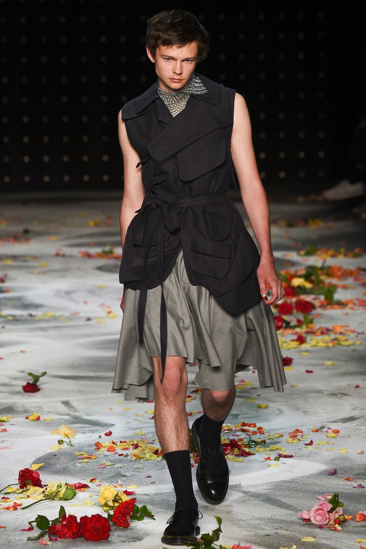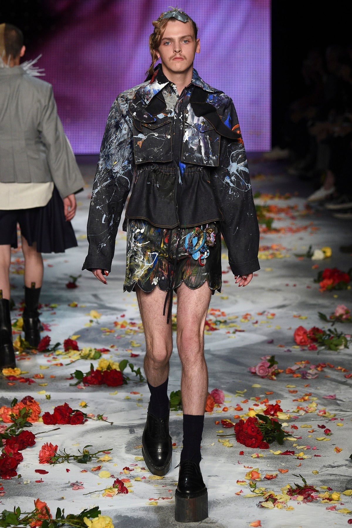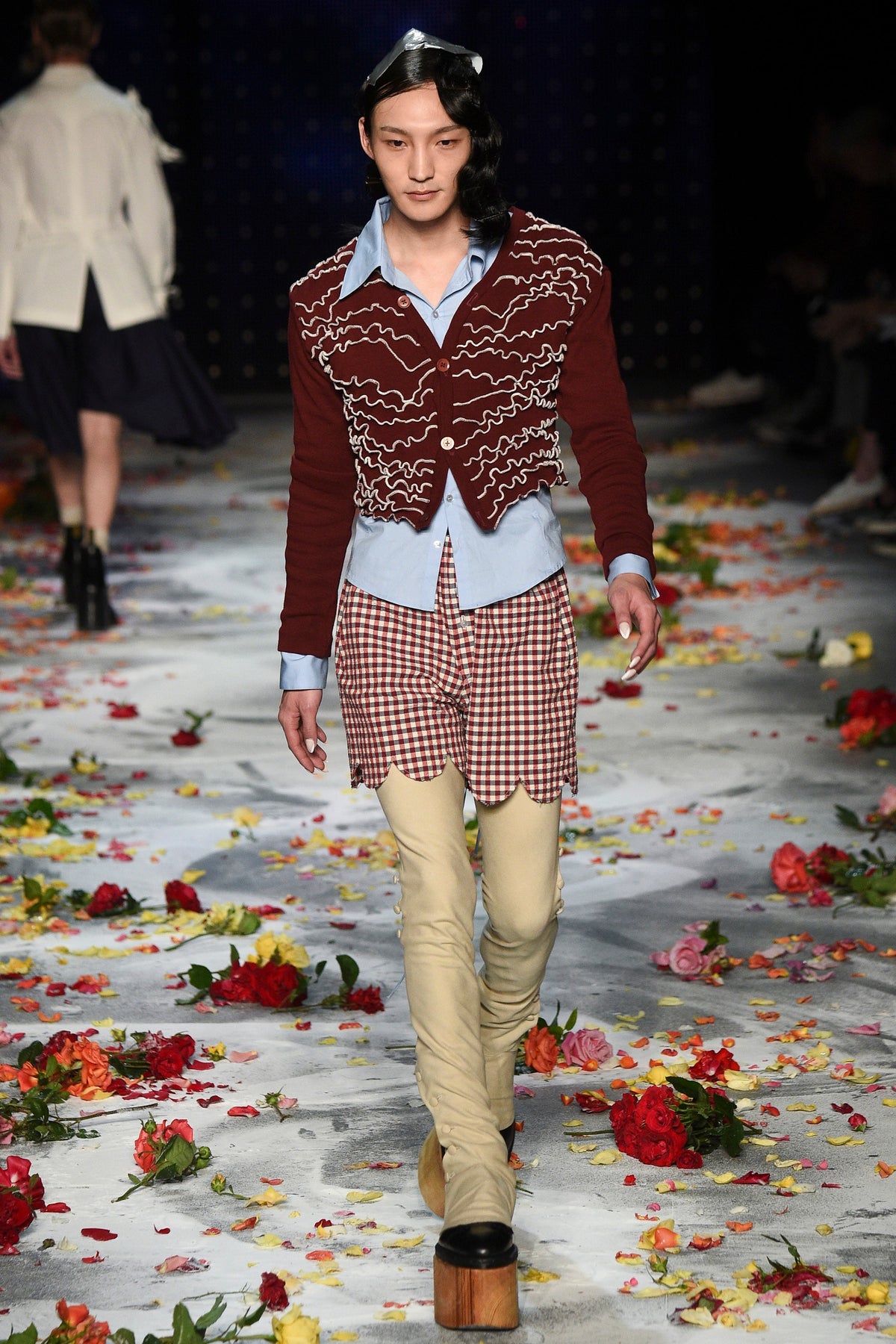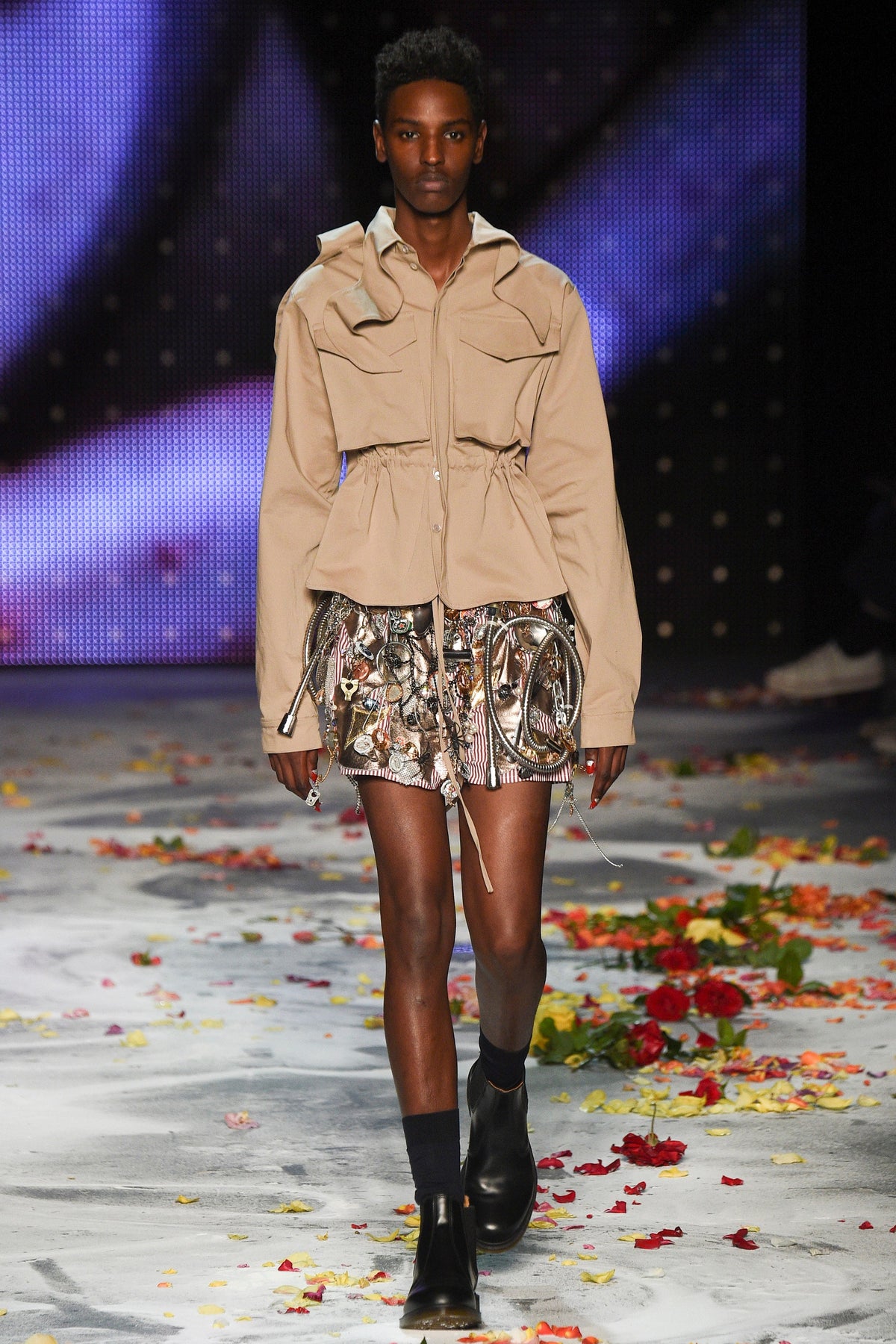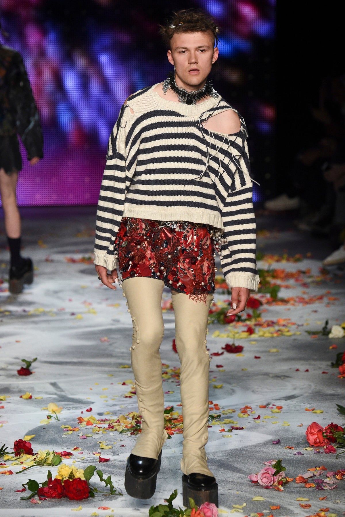 Finally to Charles Jeffrey’s LOVERBOY label (his capitals), which used the darkness of inter-designer intermission to heap the runway with flower petals. Any collection that includes a pair of boxer shorts with integrated sink-plug filter and shower tube is surely worth a second look. This one did—which was good. Because at first look, thanks in part to the arresting casting, this felt at times like a look-at-me tribute to Taboo for anachronistic chronic attention addicts. Beneath the histrionics, however, was playful fashion historicism. Jeffrey seized upon the munificence of Woolmark to incorporate fine tailoring fabrics into interesting inversions and subversions of past-period garments from Regency ruffle collars to sleeveless New Look jackets. A scallop-edged corset worn over utterly unrefined track pants was a typical epoch-clashing ensemble. Time-traveling, gender-explorational attire for extravagantly inclined Doctor Ooh-look-at-that-guy guys.