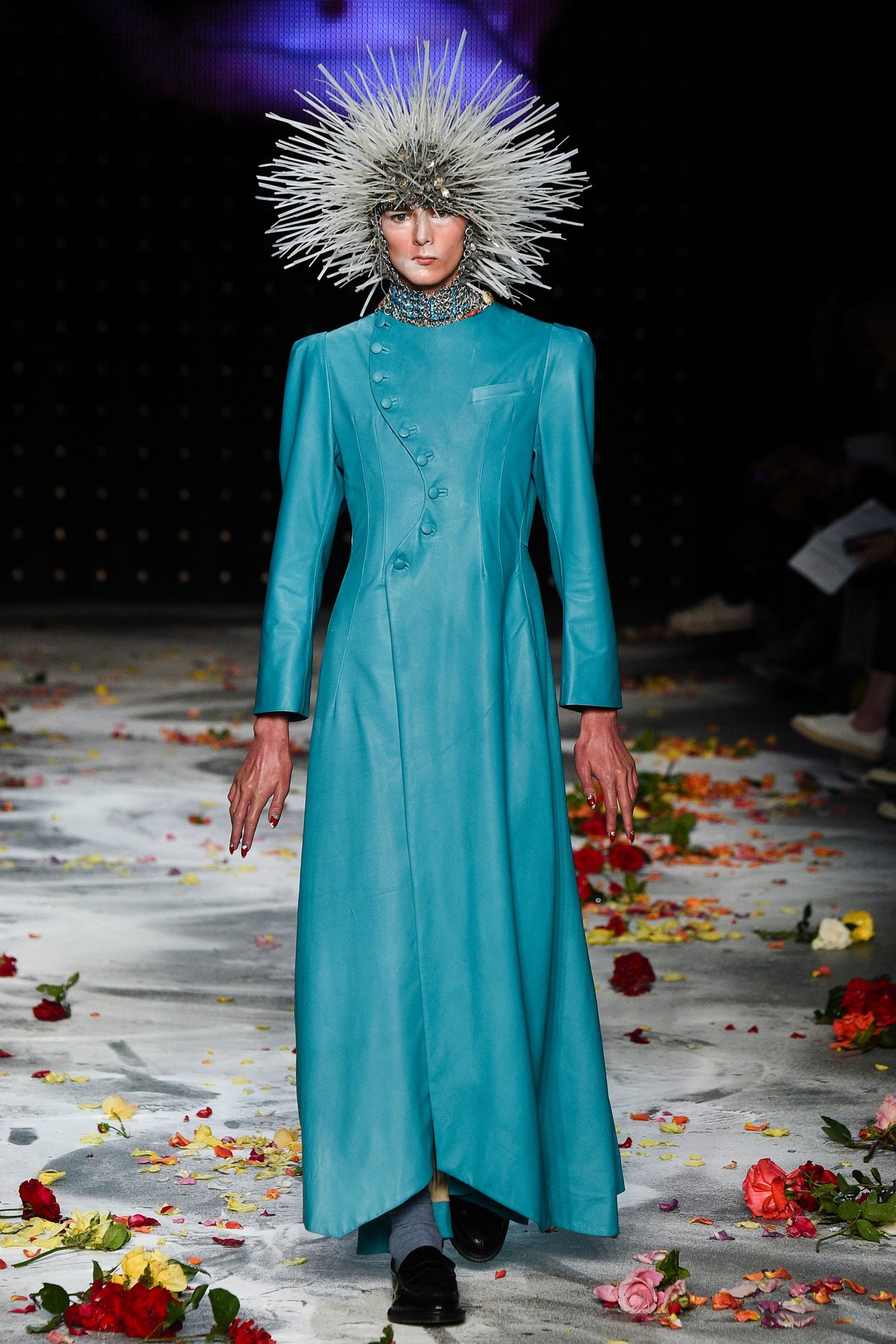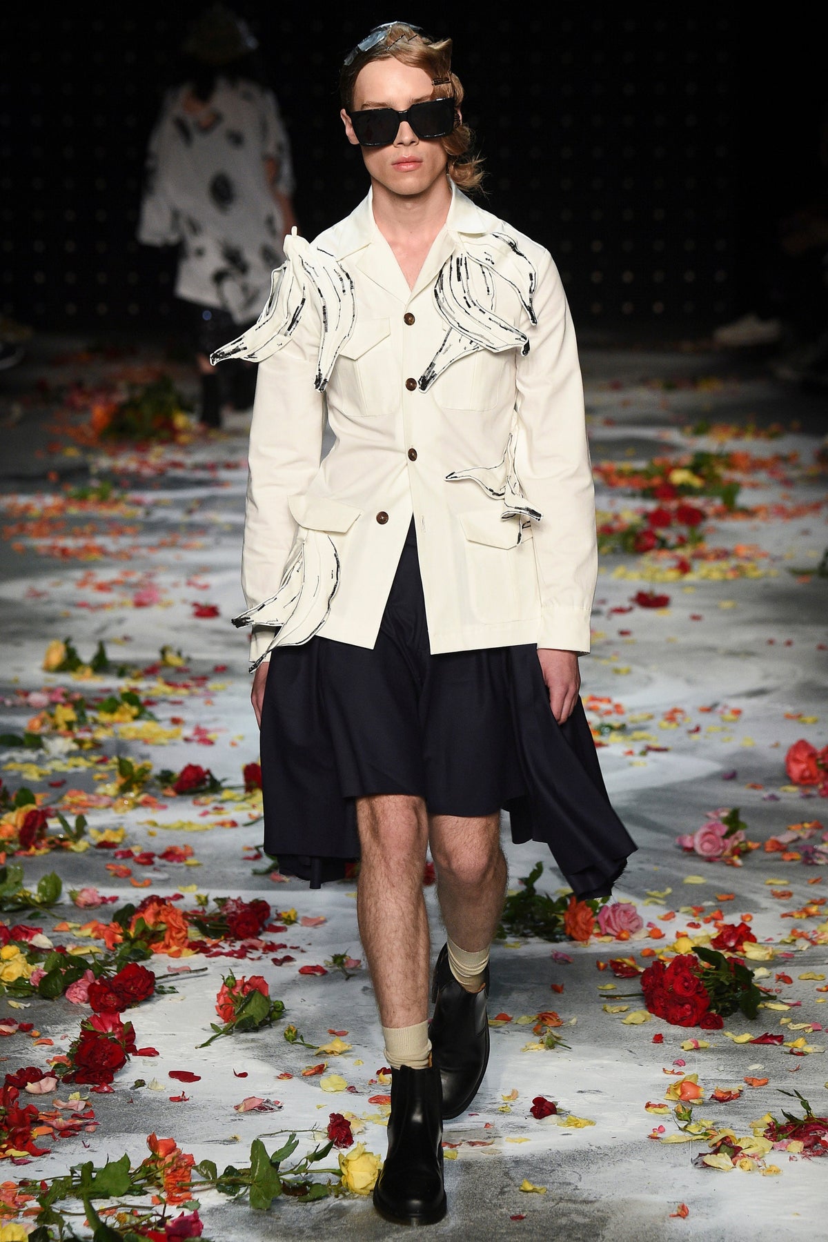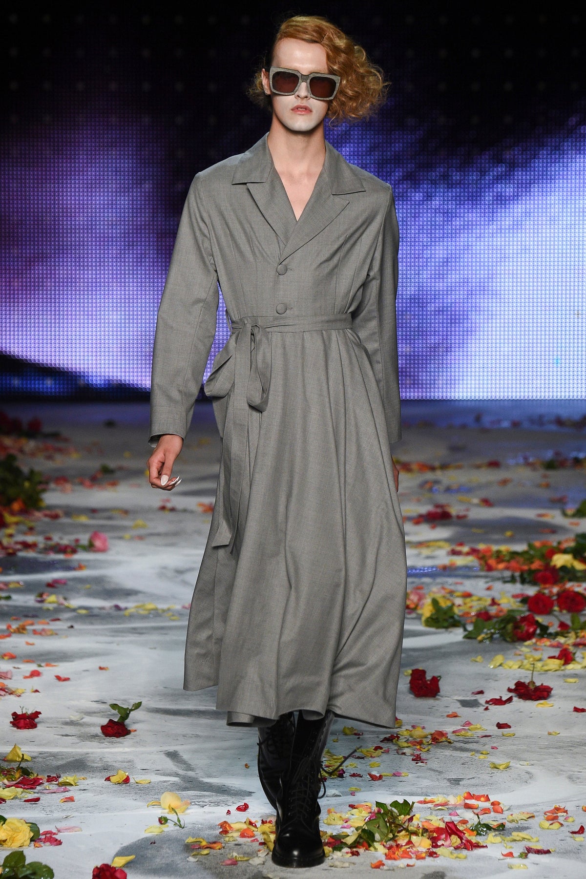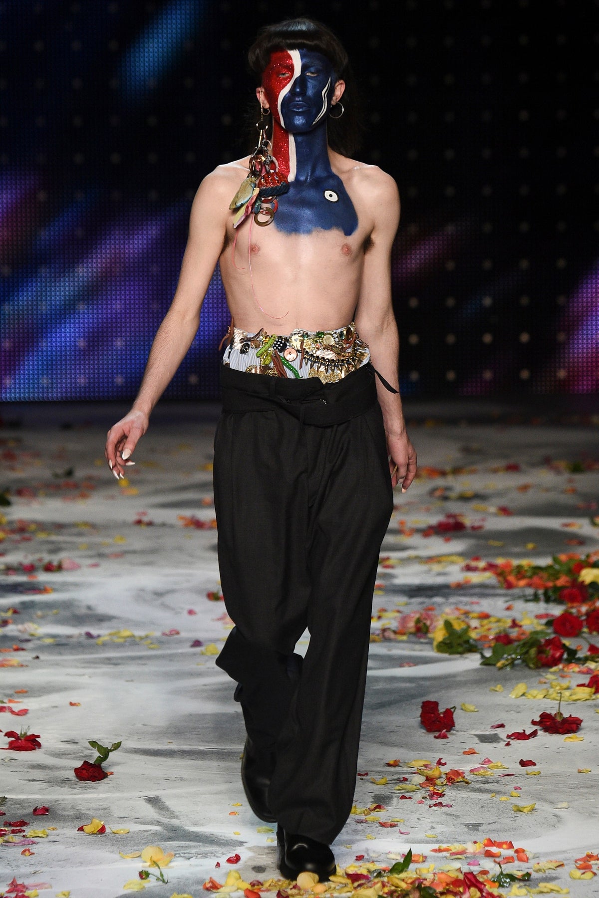 Finally to Charles Jeffrey’s LOVERBOY label (his capitals), which used the darkness of inter-designer intermission to heap the runway with flower petals. Any collection that includes a pair of boxer shorts with integrated sink-plug filter and shower tube is surely worth a second look. This one did—which was good. Because at first look, thanks in part to the arresting casting, this felt at times like a look-at-me tribute to Taboo for anachronistic chronic attention addicts. Beneath the histrionics, however, was playful fashion historicism. Jeffrey seized upon the munificence of Woolmark to incorporate fine tailoring fabrics into interesting inversions and subversions of past-period garments from Regency ruffle collars to sleeveless New Look jackets. A scallop-edged corset worn over utterly unrefined track pants was a typical epoch-clashing ensemble. Time-traveling, gender-explorational attire for extravagantly inclined Doctor Ooh-look-at-that-guy guys.