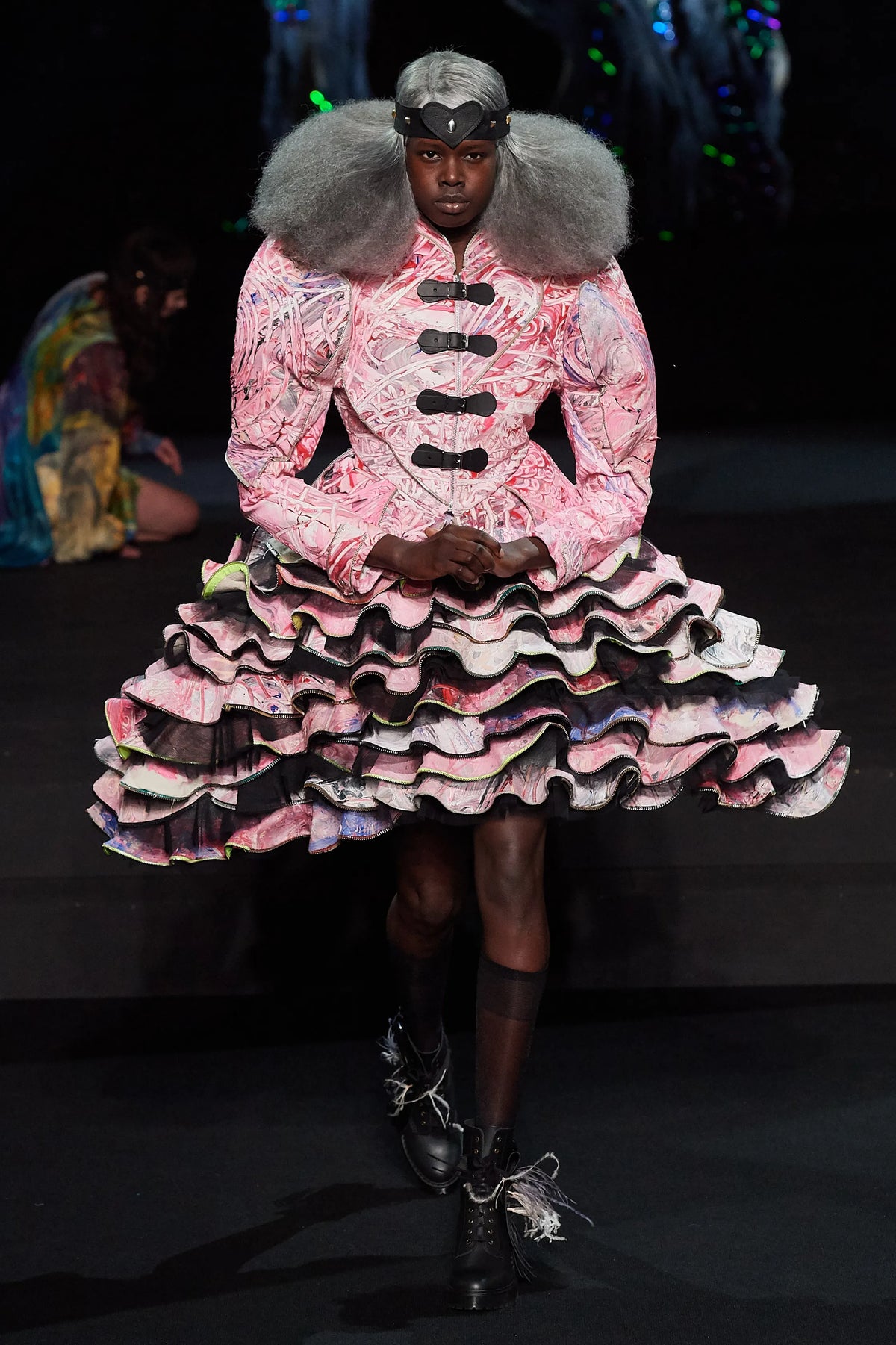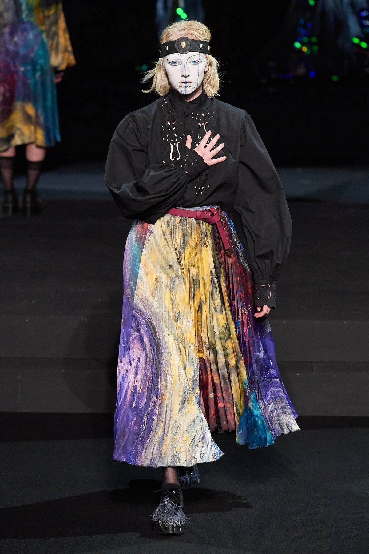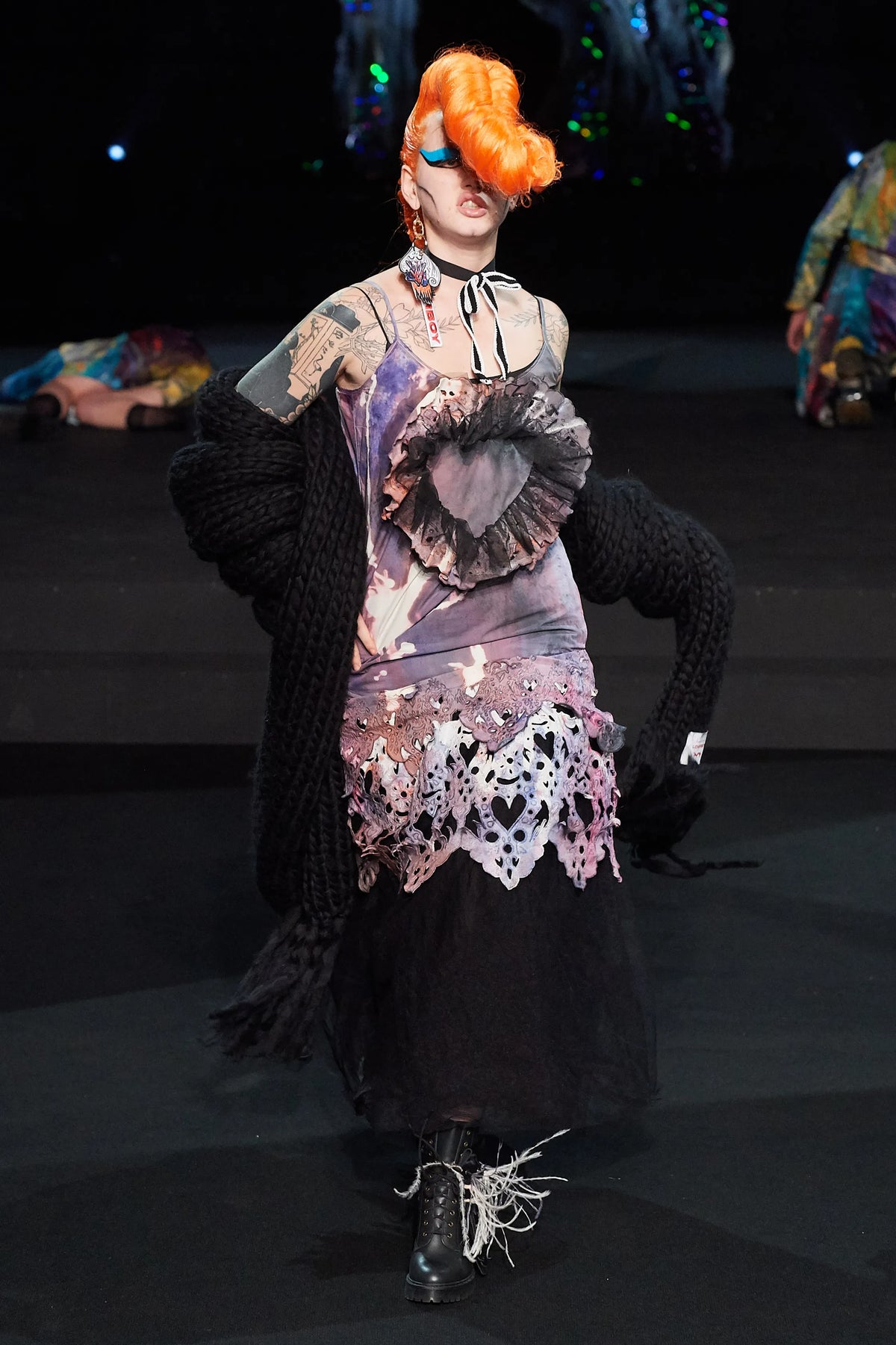 The GLAEDYHOOTS themselves are sensuousness, selflessness, grace in the midst of strife. They are magical crafters, emotionally, delicately intelligent – glade-dwellers, migraine-disappears, soothers – practical reclaimers of the word ‘exquisite’. Mauves, rose, river-greens are the palette here as, for a GLAEDYHOOT the heart is more flower than flesh, a hopeful blossom between bud and bloom, just unfurling – yet quite strong enough to structure a coat-dress or gown. Spiral-ruffled sleeves and silky pleated full skirts floating on black tulle underlayers point to a painterly people, hand decorated with eddies of colour which speak of forest dapple and river-pool reflections, naturalistic reminiscences from a world in which only traces of nature remain.