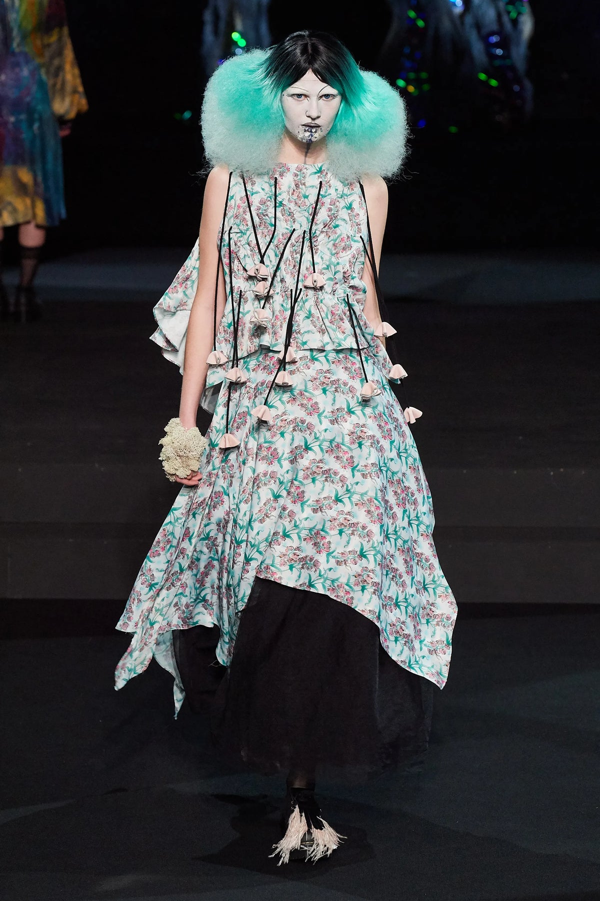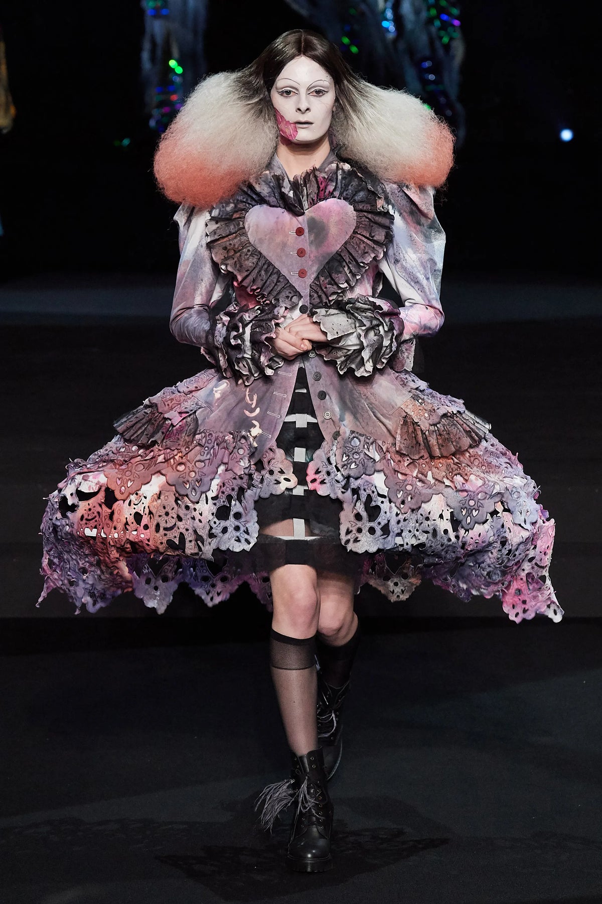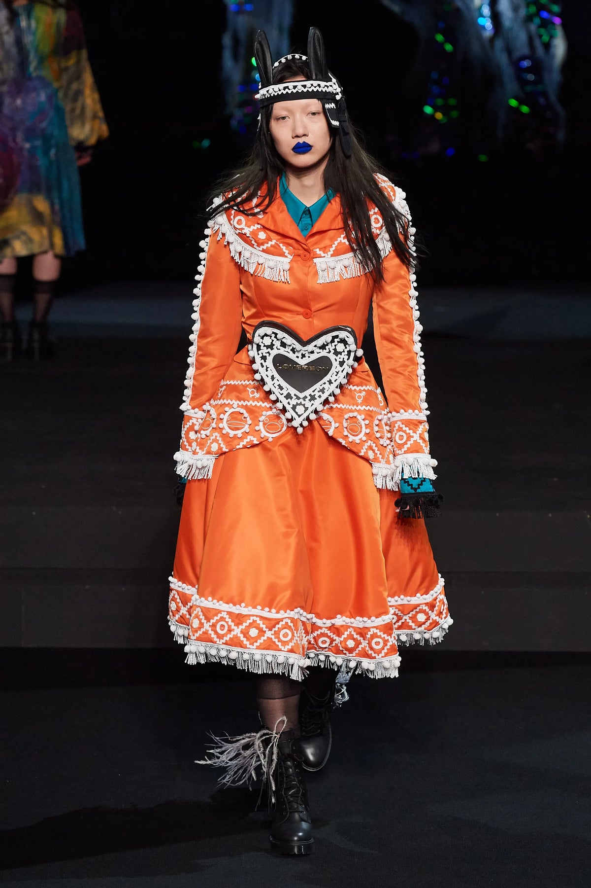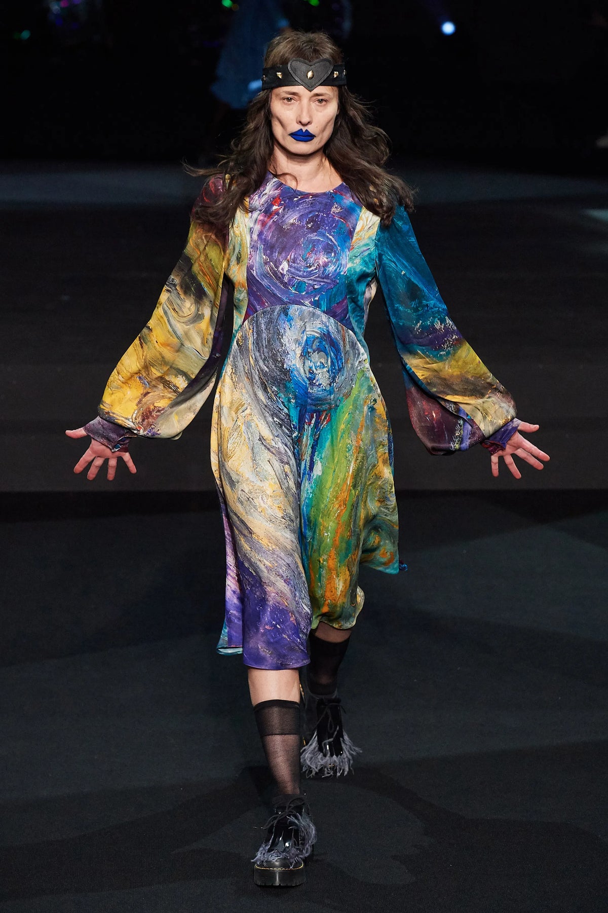 The GLAEDYHOOTS themselves are sensuousness, selflessness, grace in the midst of strife. They are magical crafters, emotionally, delicately intelligent – glade-dwellers, migraine-disappears, soothers – practical reclaimers of the word ‘exquisite’. Mauves, rose, river-greens are the palette here as, for a GLAEDYHOOT the heart is more flower than flesh, a hopeful blossom between bud and bloom, just unfurling – yet quite strong enough to structure a coat-dress or gown. Spiral-ruffled sleeves and silky pleated full skirts floating on black tulle underlayers point to a painterly people, hand decorated with eddies of colour which speak of forest dapple and river-pool reflections, naturalistic reminiscences from a world in which only traces of nature remain.